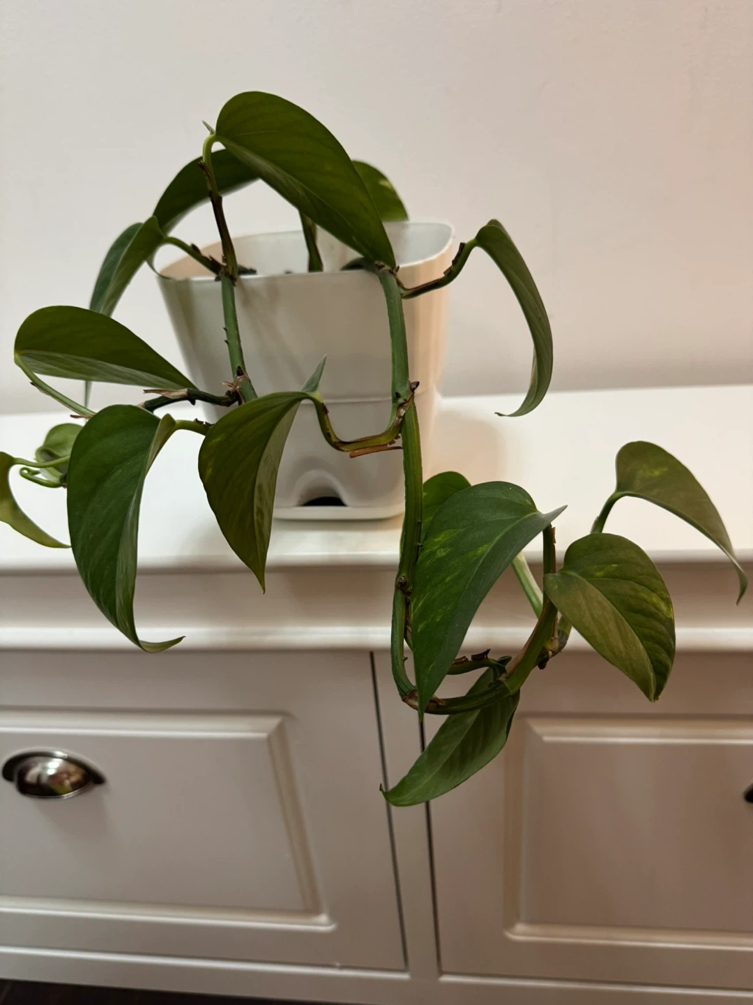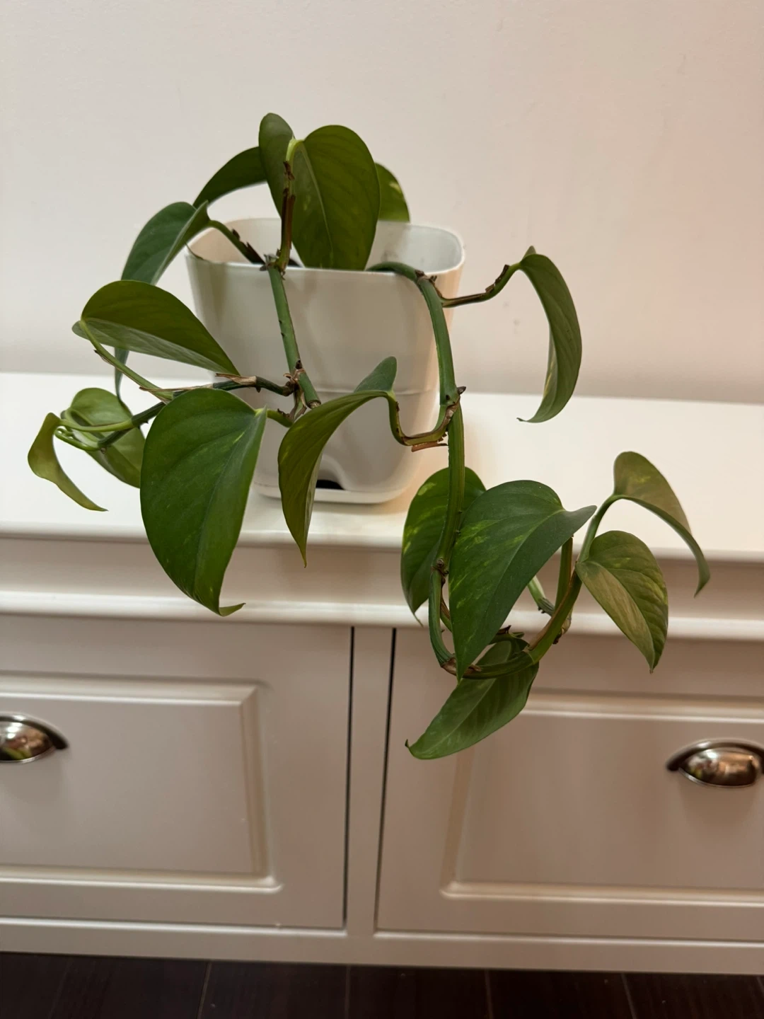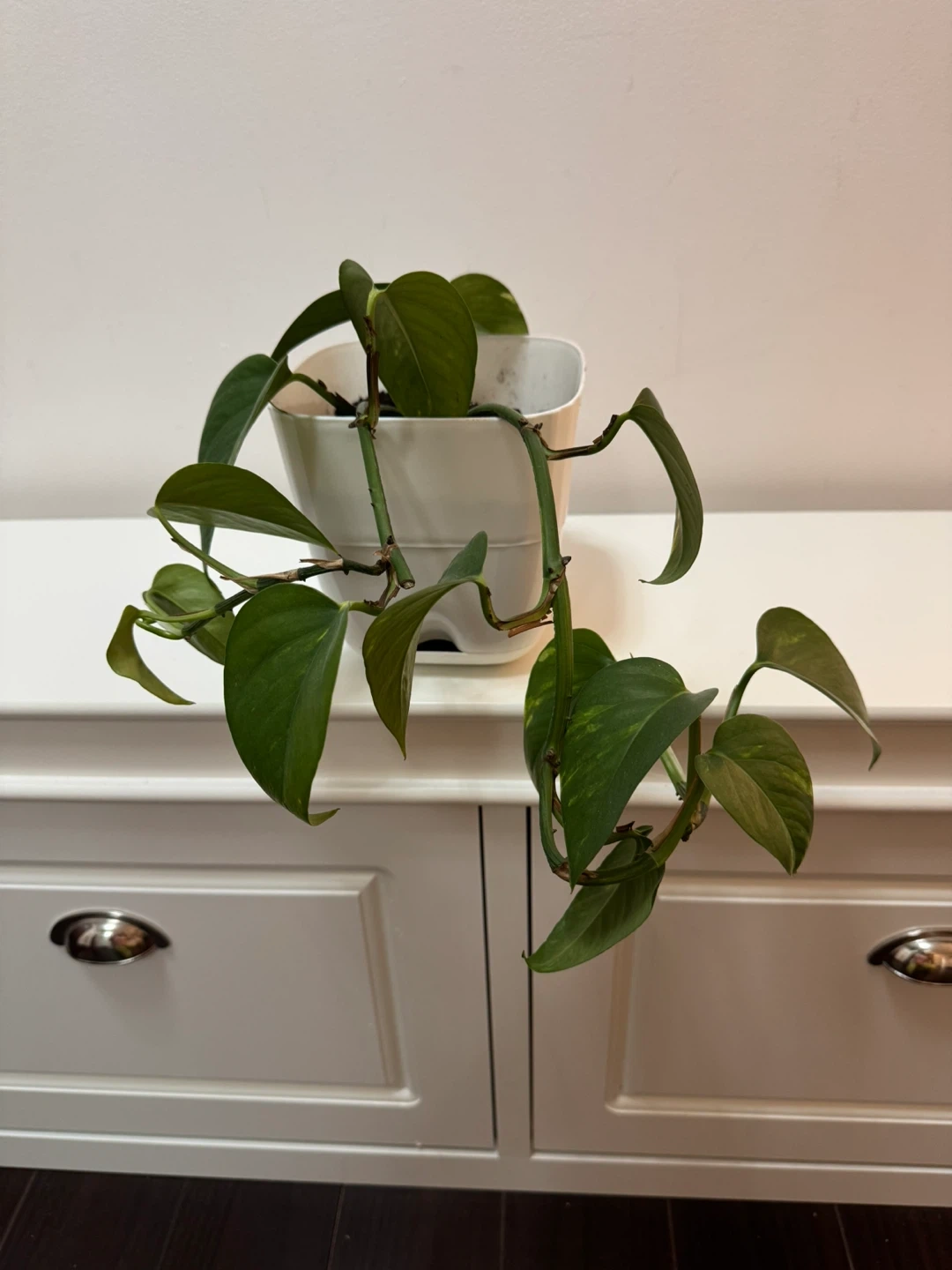 Healthy Pothos plant with trailing vines in a simple white pot. It's a low-maintenance houseplant that's easy to care for. This plant would look great on a shelf or hanging.