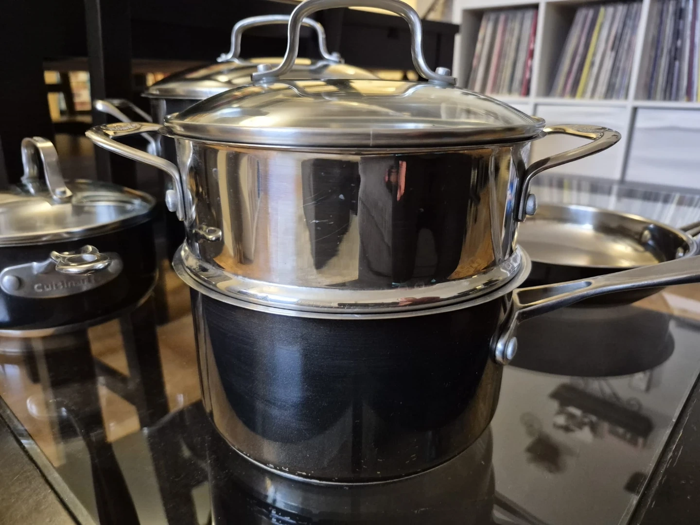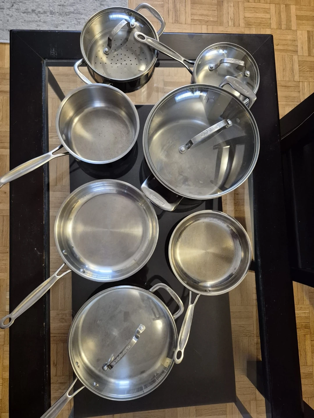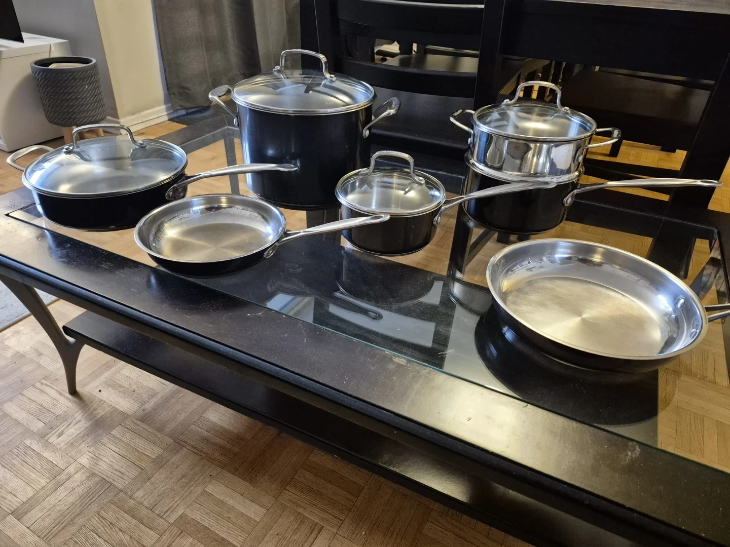 Cuisinart stainless steel enameled cookware set. Complete set with lids. The black enamel on the outside is chipped in some spots, that is the only issue
