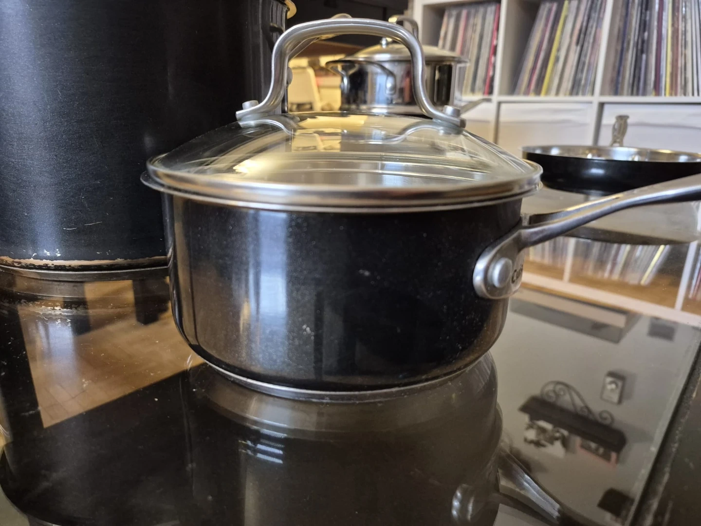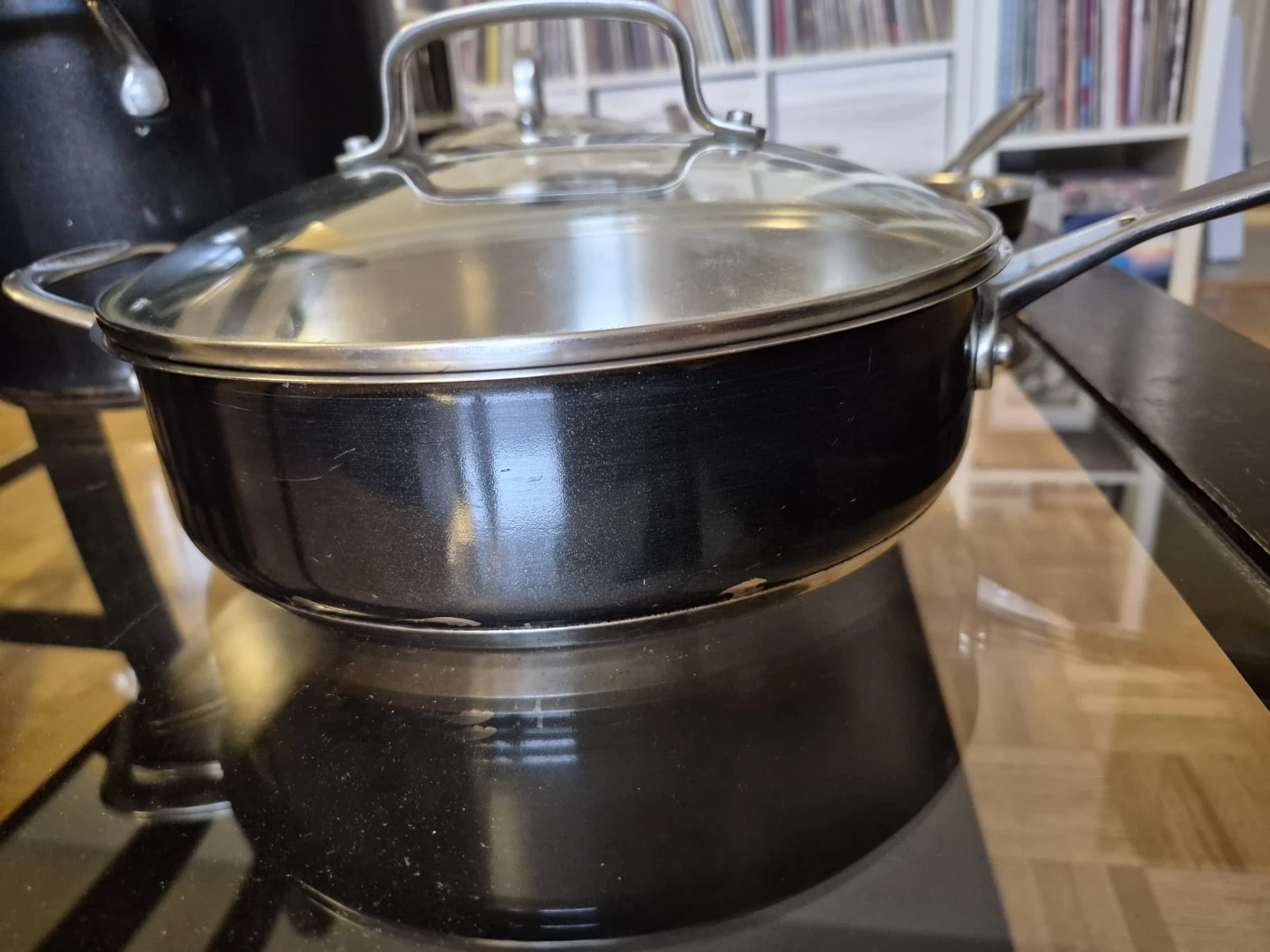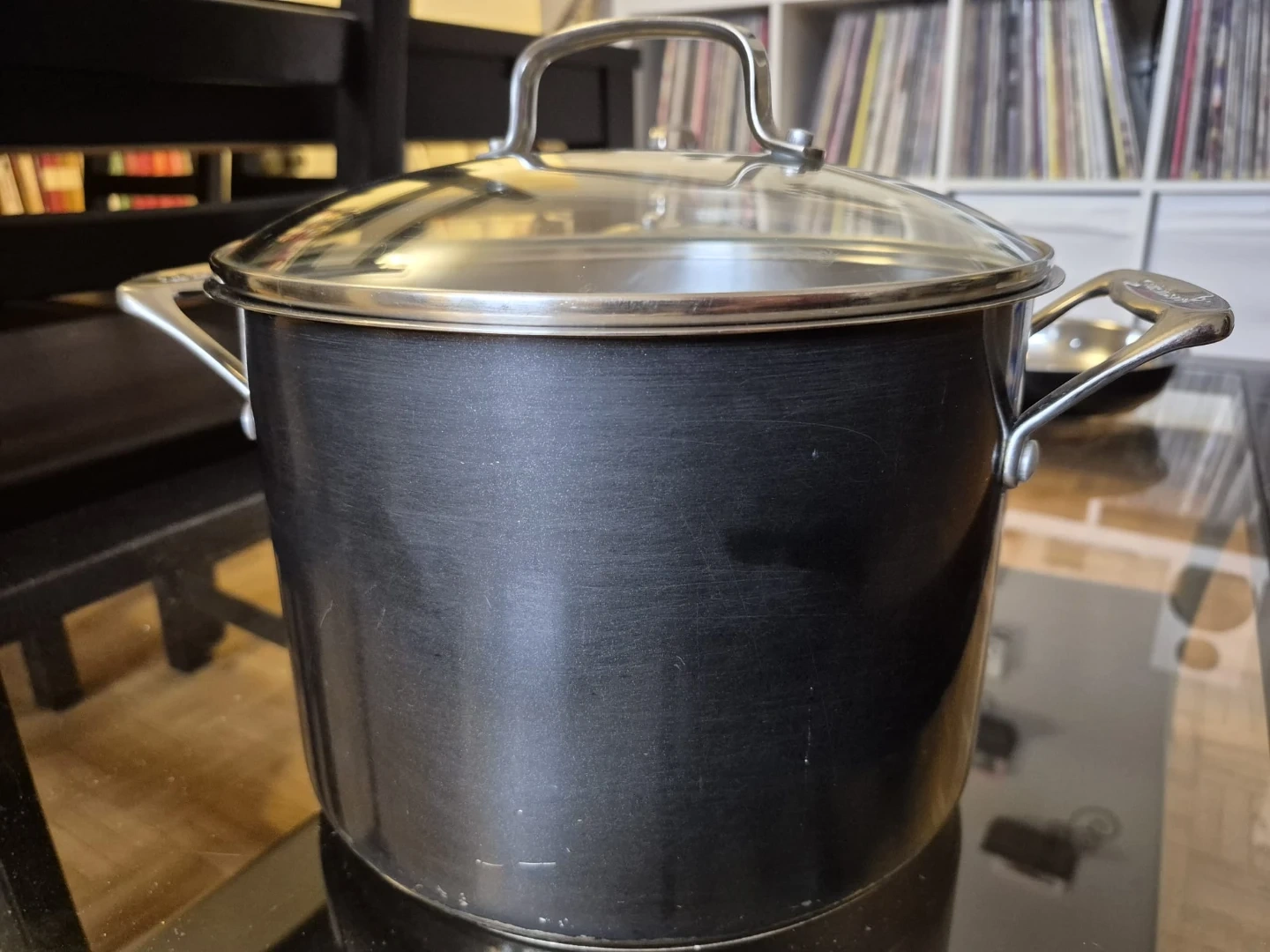 Cuisinart stainless steel enameled cookware set. Complete set with lids. The black enamel on the outside is chipped in some spots, that is the only issue