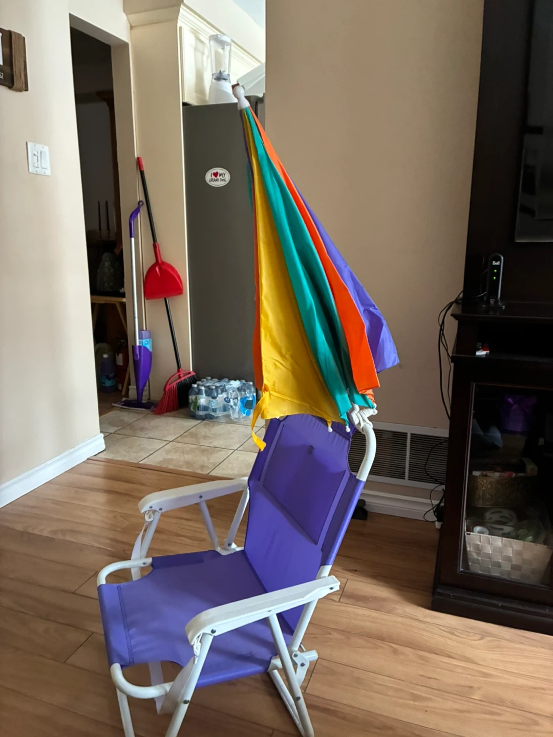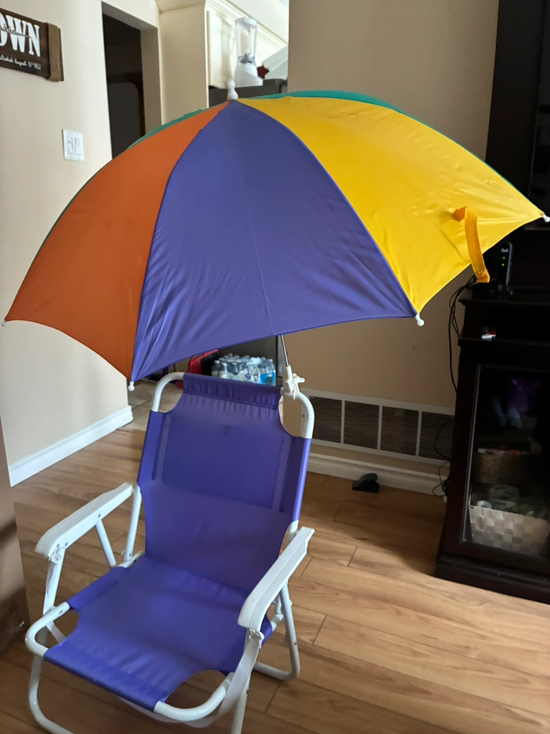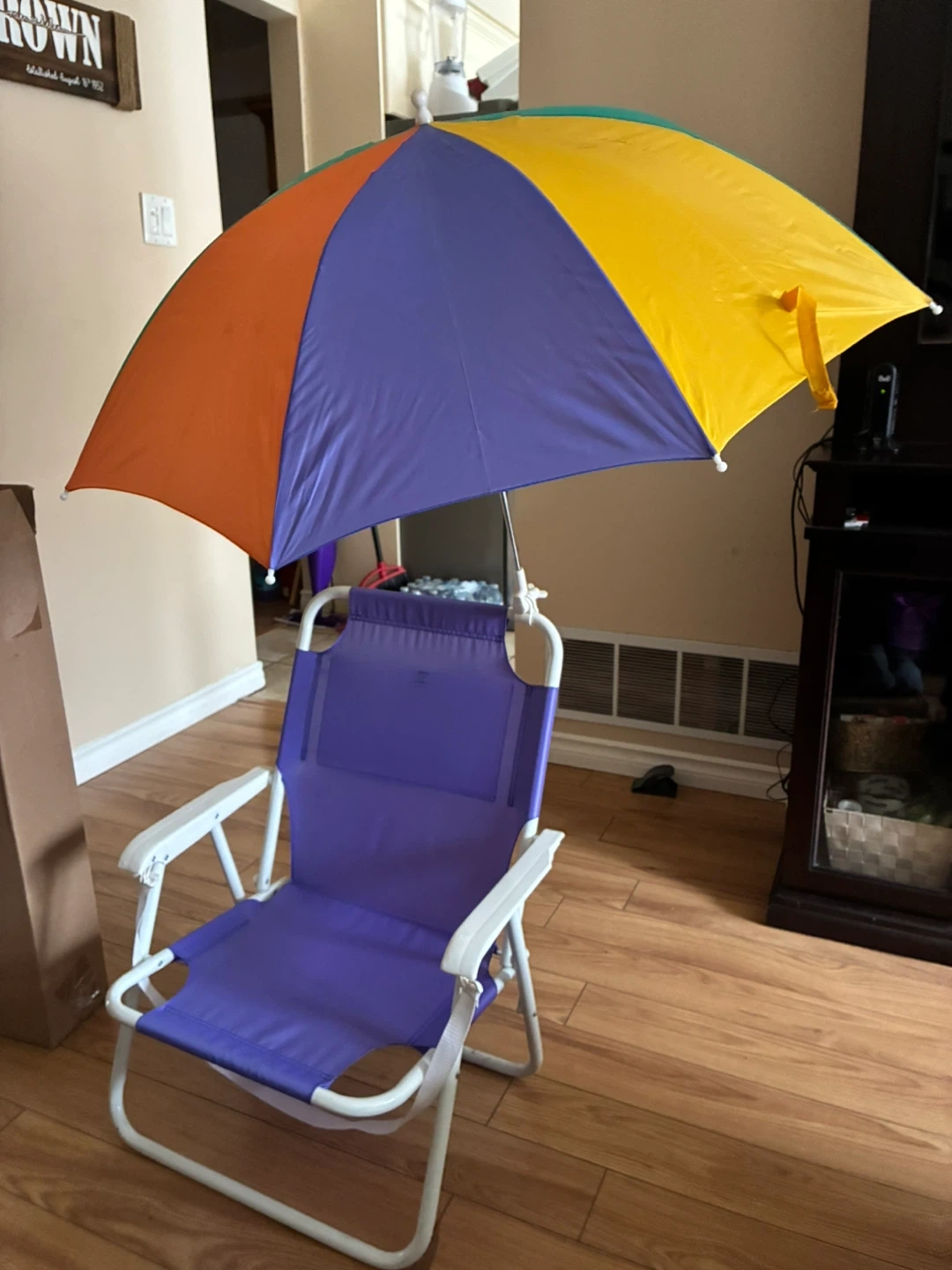 This is a portable purple beach chair with an attached, multi-coloured umbrella. It's perfect for the beach or camping! The chair has white metal armrests and a sturdy frame. Perfect for children or young adults.