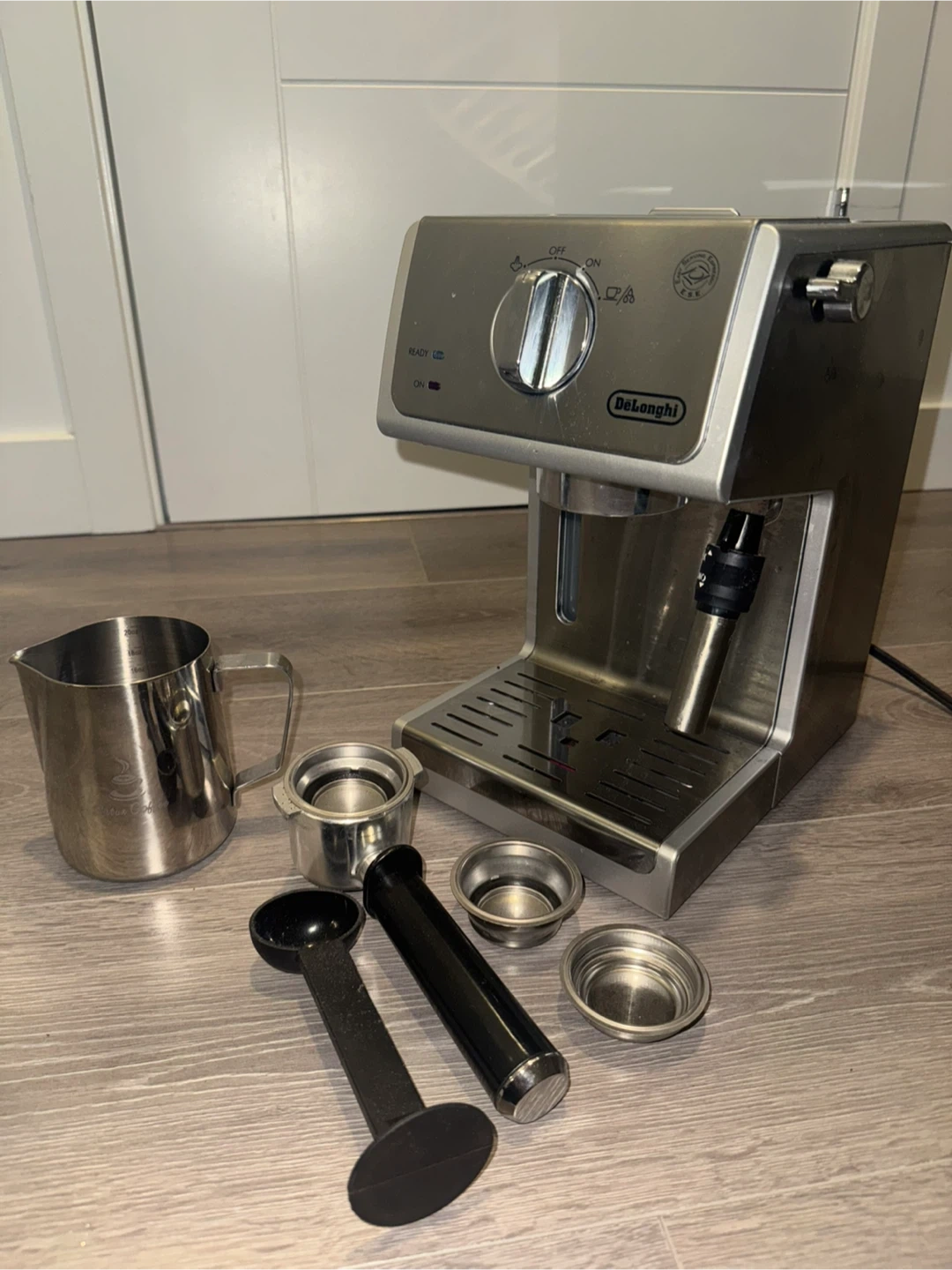 Selling a Delonghi espresso machine that's ready to make some delicious coffee! It comes with all the accessories you see in the pictures, including the milk frothing pitcher, portafilter, tamper, and several filter baskets. It's in perfect working condition and would be a great addition to any coffee lover's kitchen.
