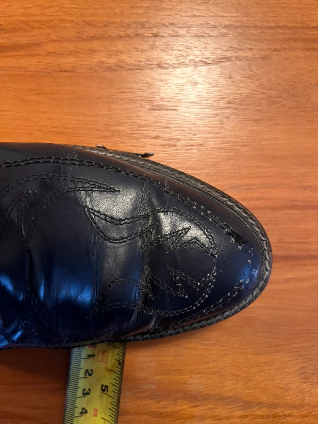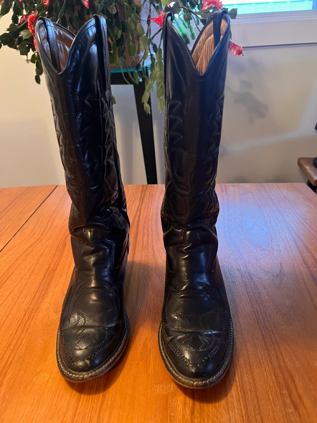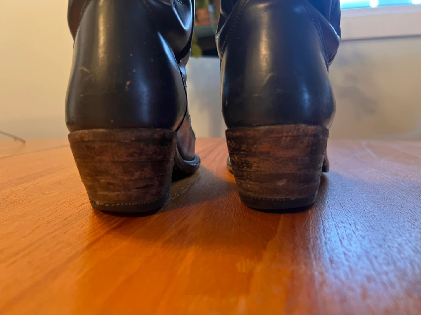 Selling a pair of navy leather cowboy boots. They show some signs of wear, particularly on the soles and toes, but are still in good condition for their age. Please see the photos for details! #Cleanout