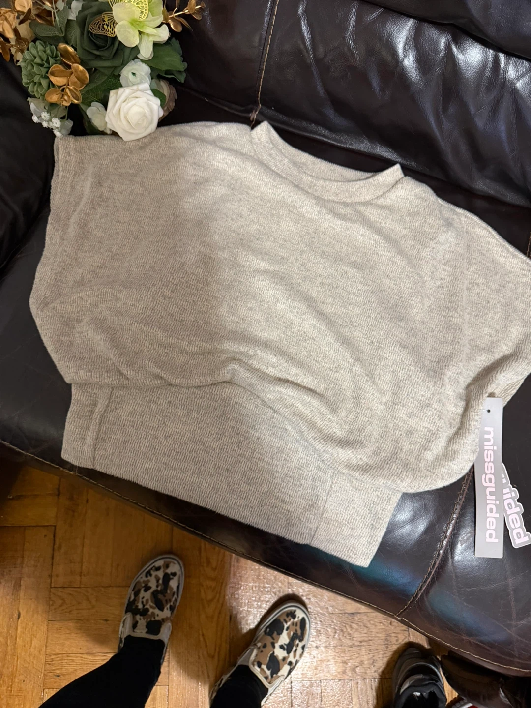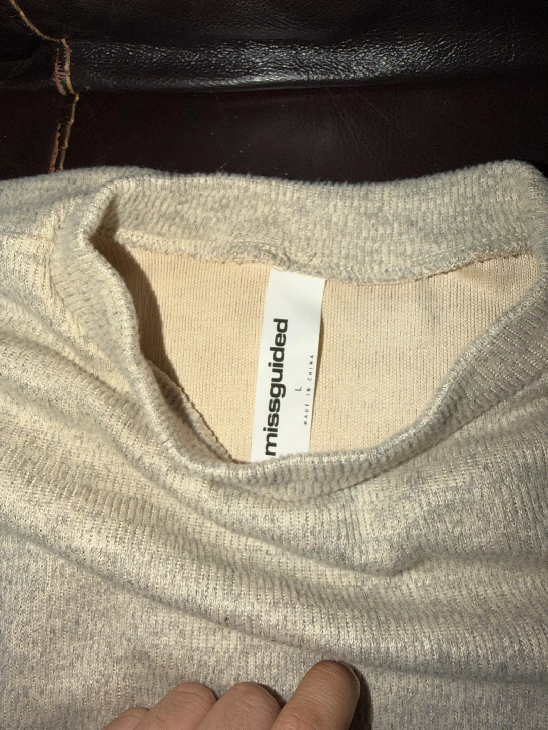 Cozy knit sweater from Missguided. It's a beige, oversized fit with a crew neck. Made of a soft, textured material. Size L.