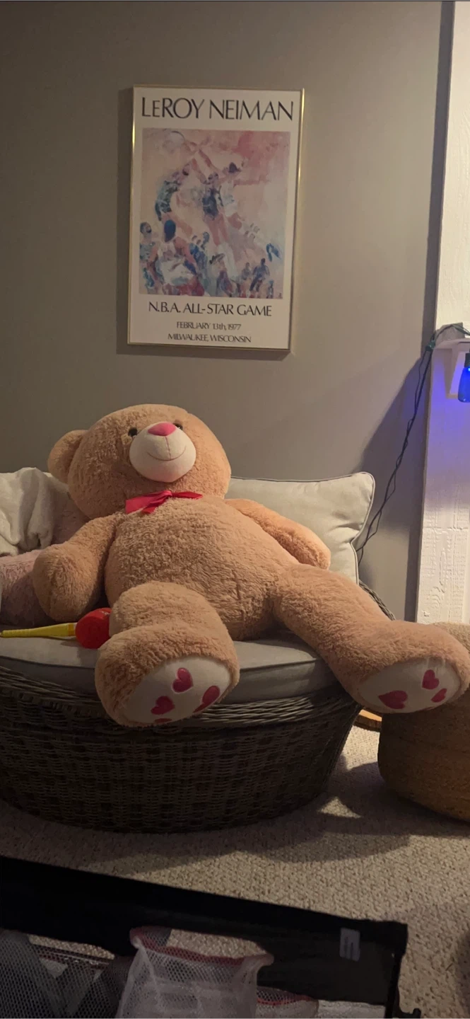 This is a large, soft brown teddy bear with a cute pink bow. It has little pink hearts on its paws. It's perfect for cuddling and would make a great gift!
