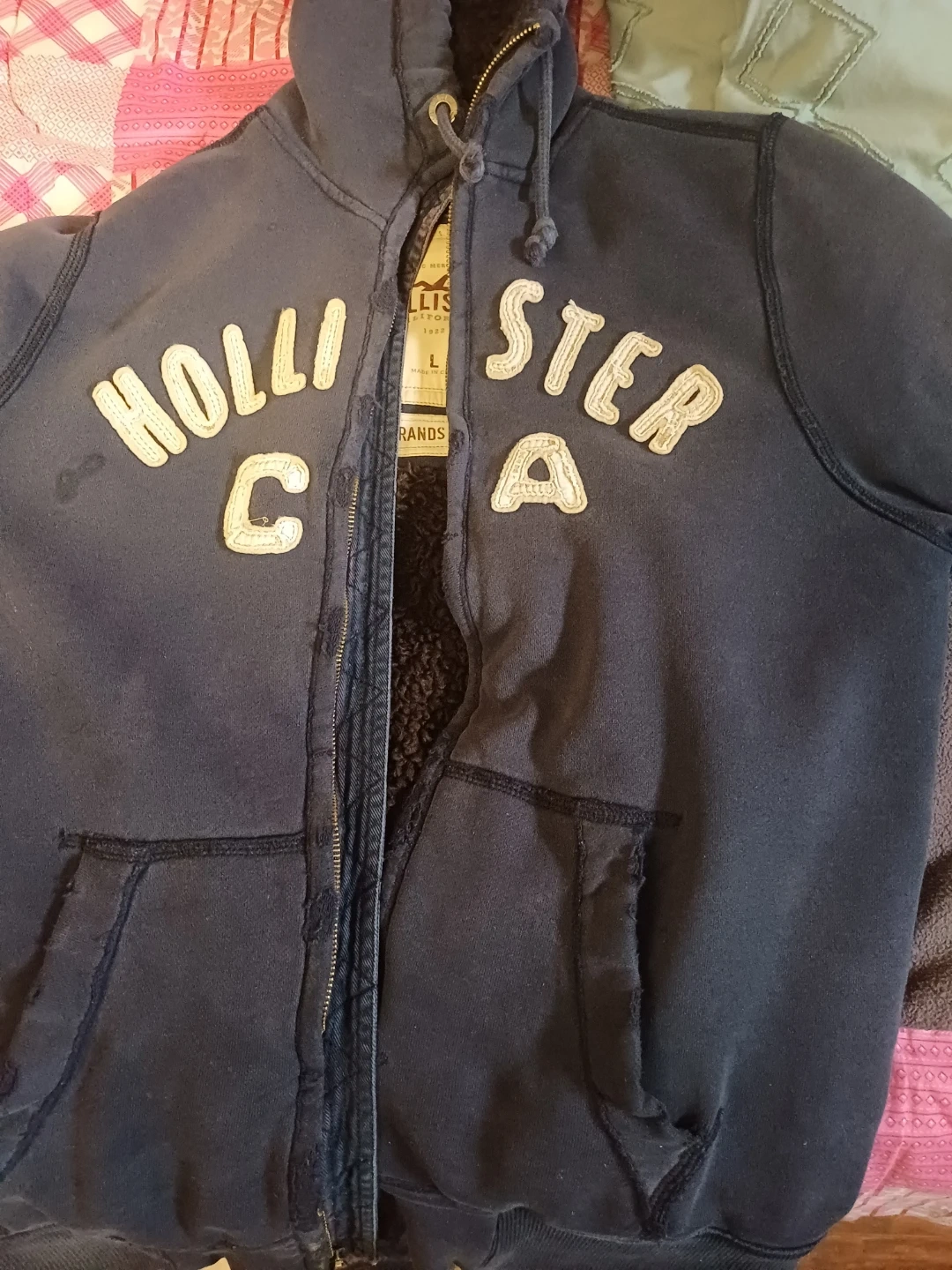 This is a Hollister zip-up hoodie, size large, with a cozy sherpa lining. It's a dark navy blue colour with the 'Hollister' logo across the chest. Perfect for cooler Canadian weather!