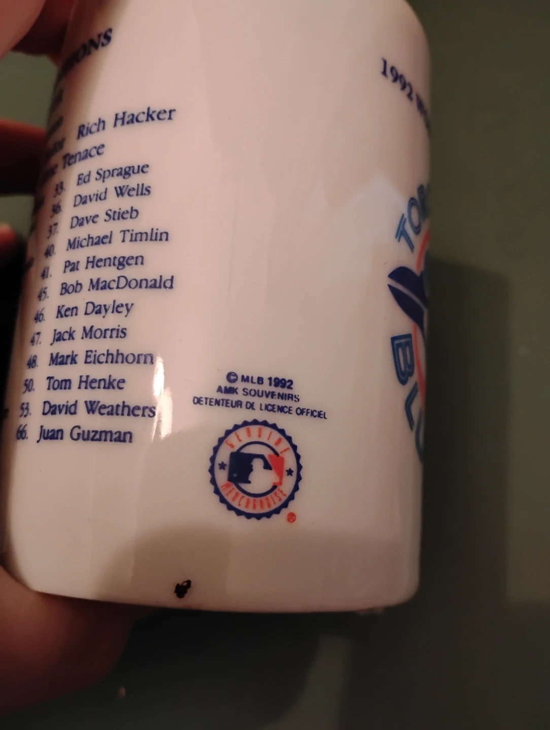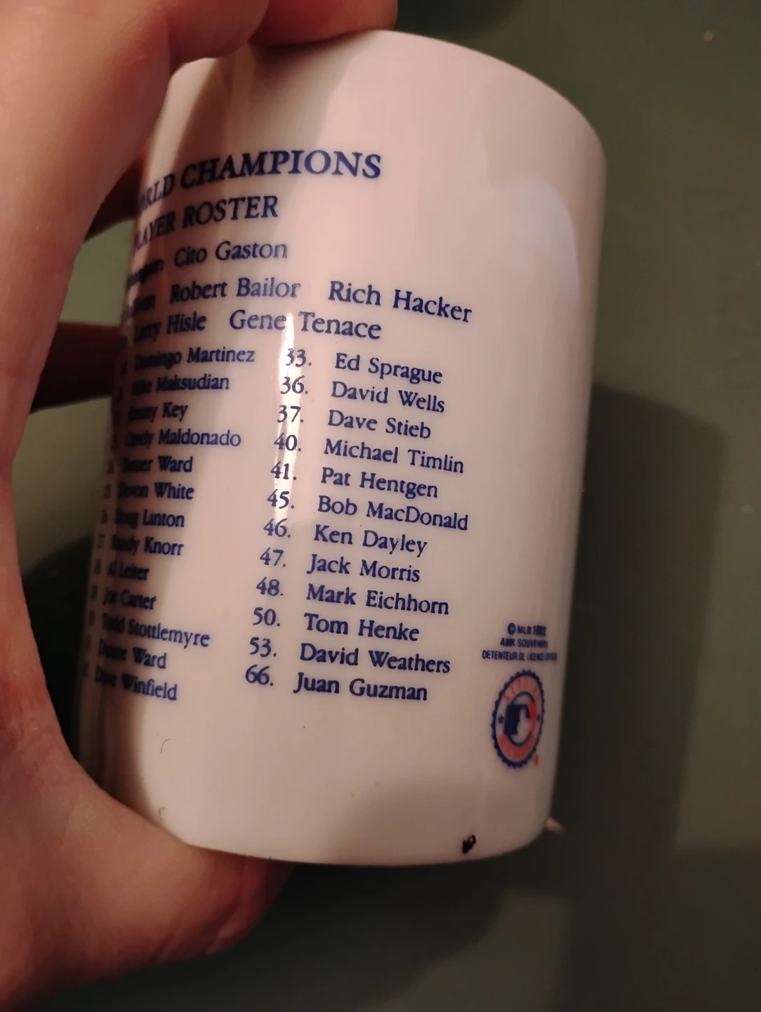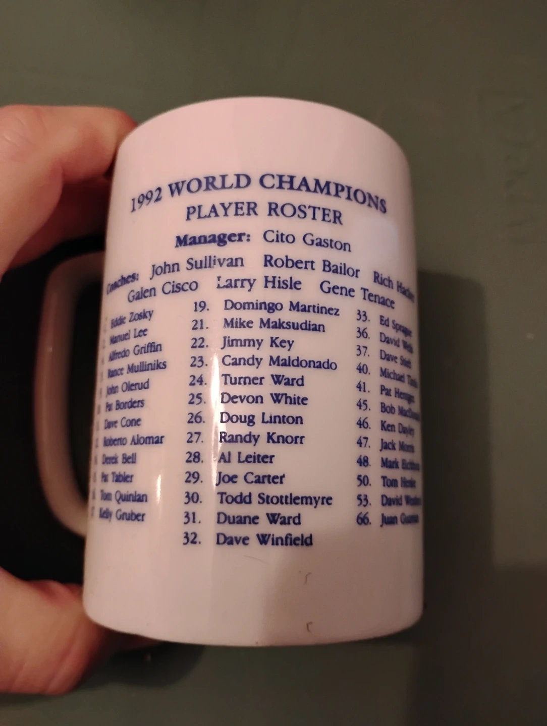 VINTAGE! 1992 BLUE JAYS WORLD SERIES CHAMPIONS MUG. AS YOU CAN SEE IN THE PHOTOS, THE MANAGERS AND PLAYERS NAMES ARE ON IT.