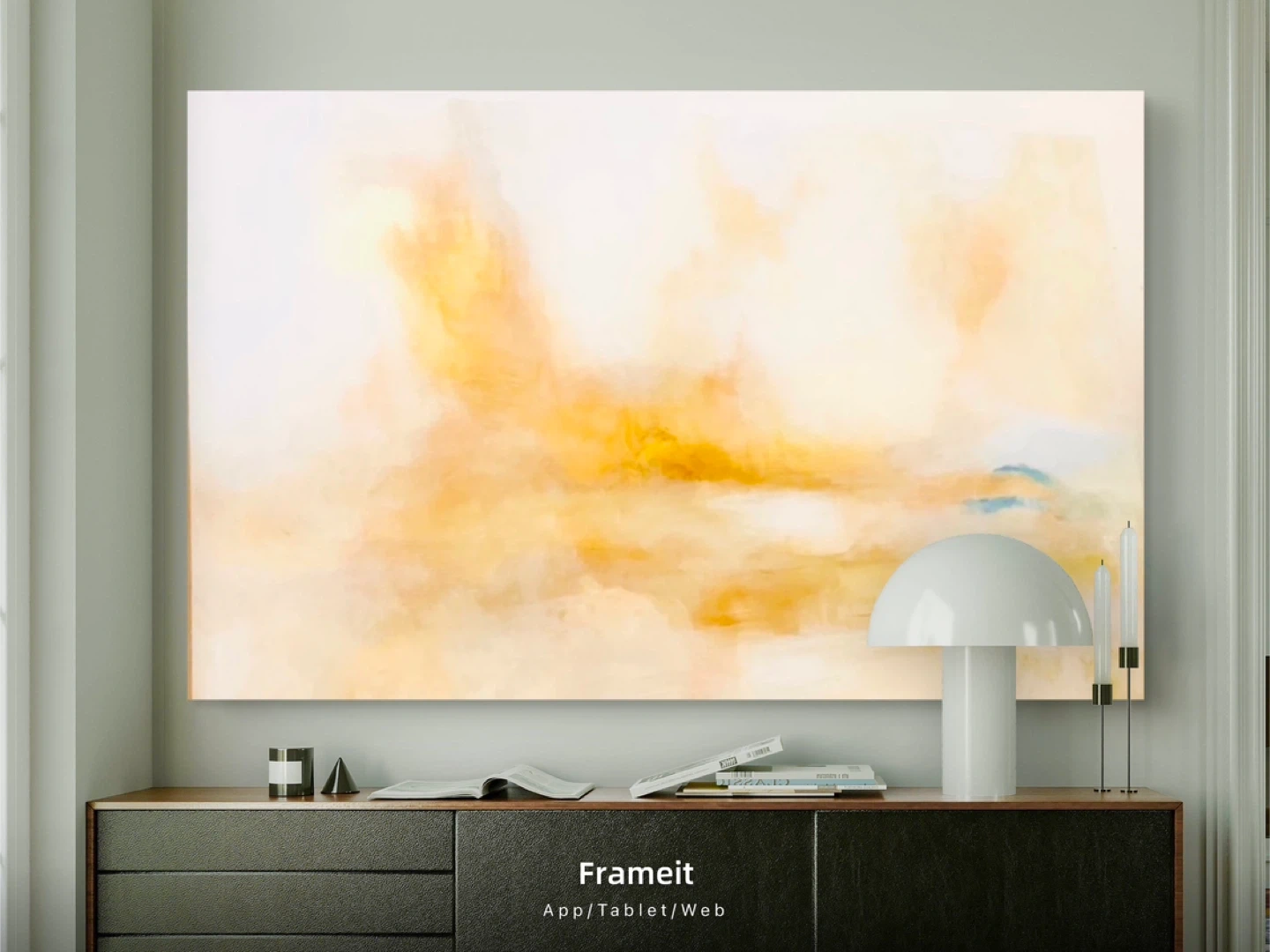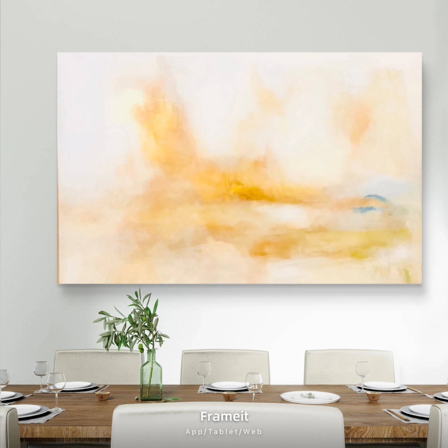 This is a large abstract landscape art piece with warm yellow, orange, and white tones. It's perfect for adding a splash of colour to any room. 44x66 signed canvas