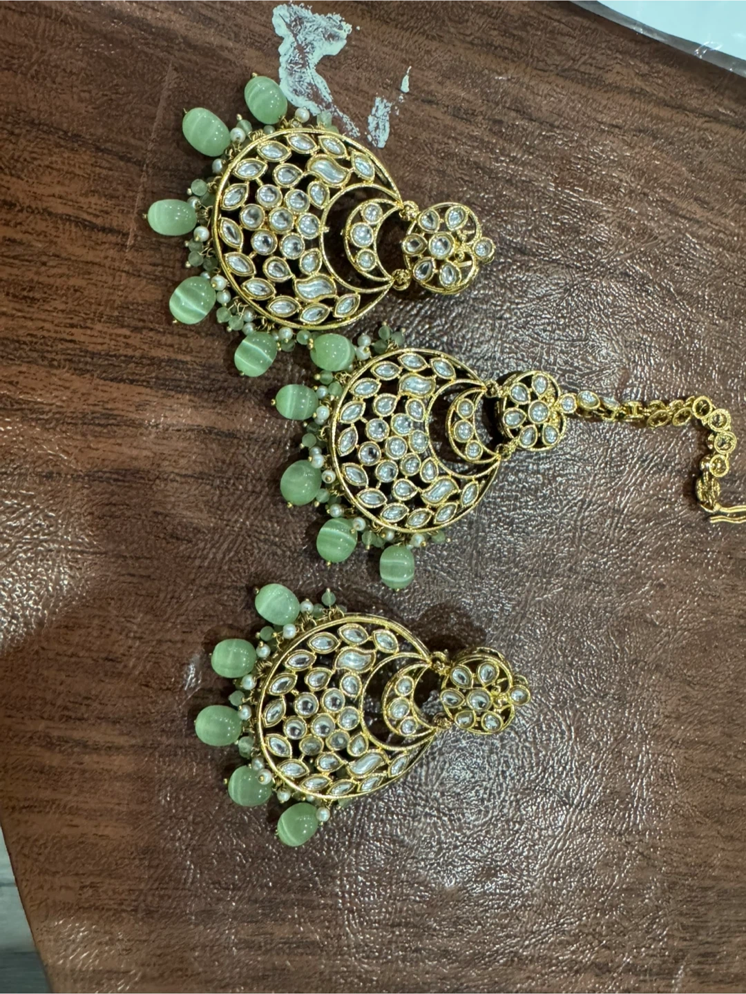 Beautiful three-piece jewellery set. It's gold-toned with intricate Kundan work and accented with pretty green beads. This set includes a pair of chandelier earrings and a matching tikka. Perfect for adding a touch of elegance to traditional outfits!