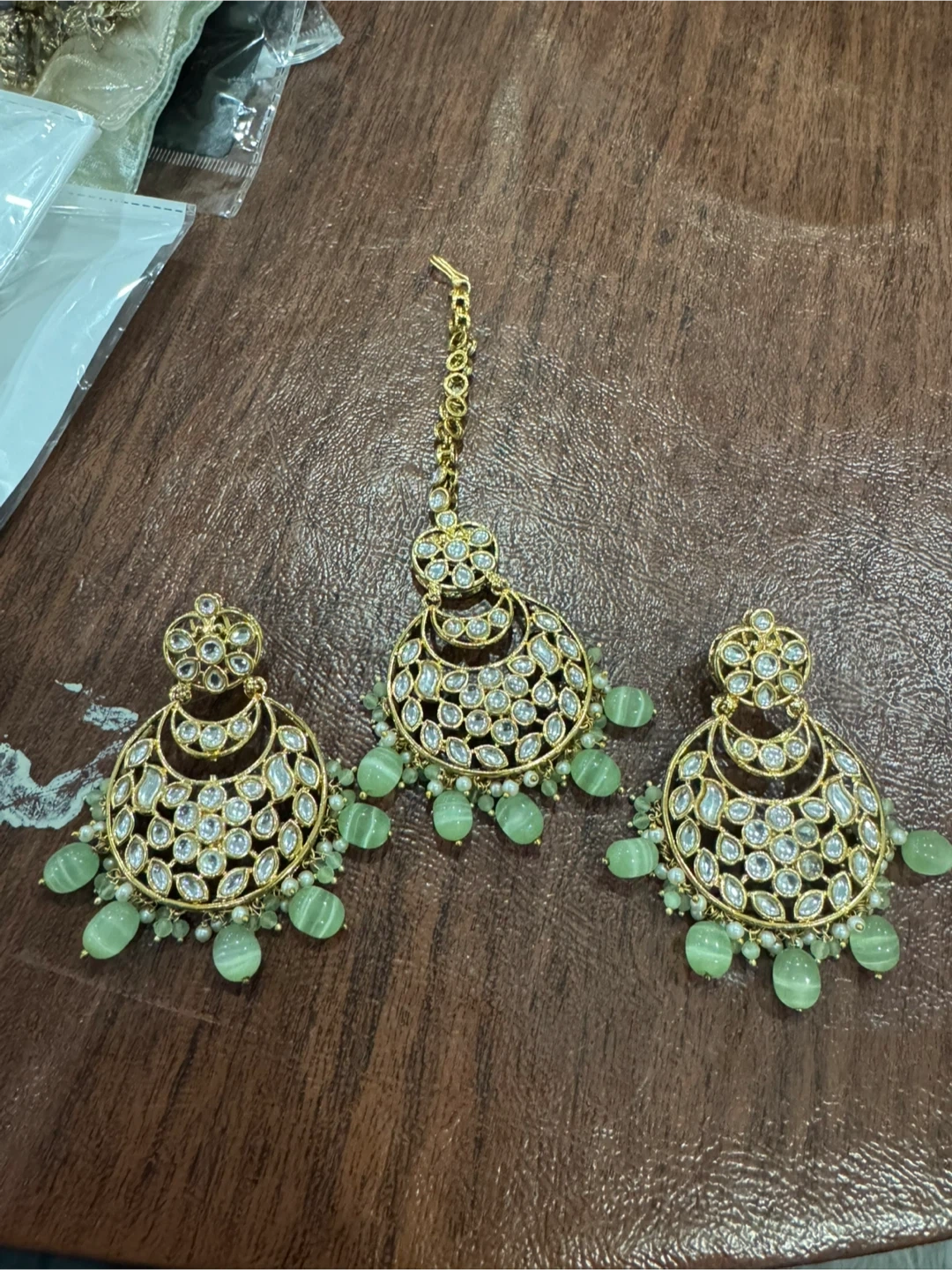 Gold Tone Kundan Earrings and Tikka Set with Green Beads