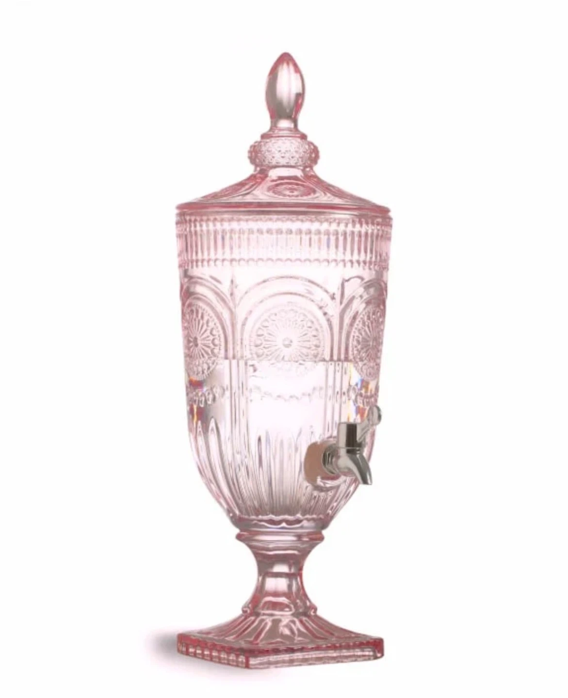 This decorative glass beverage dispenser comes in a lovely pink hue. It features an ornate embossed design and a convenient metal spigot for easy pouring. It's perfect for serving drinks at parties or gatherings!
