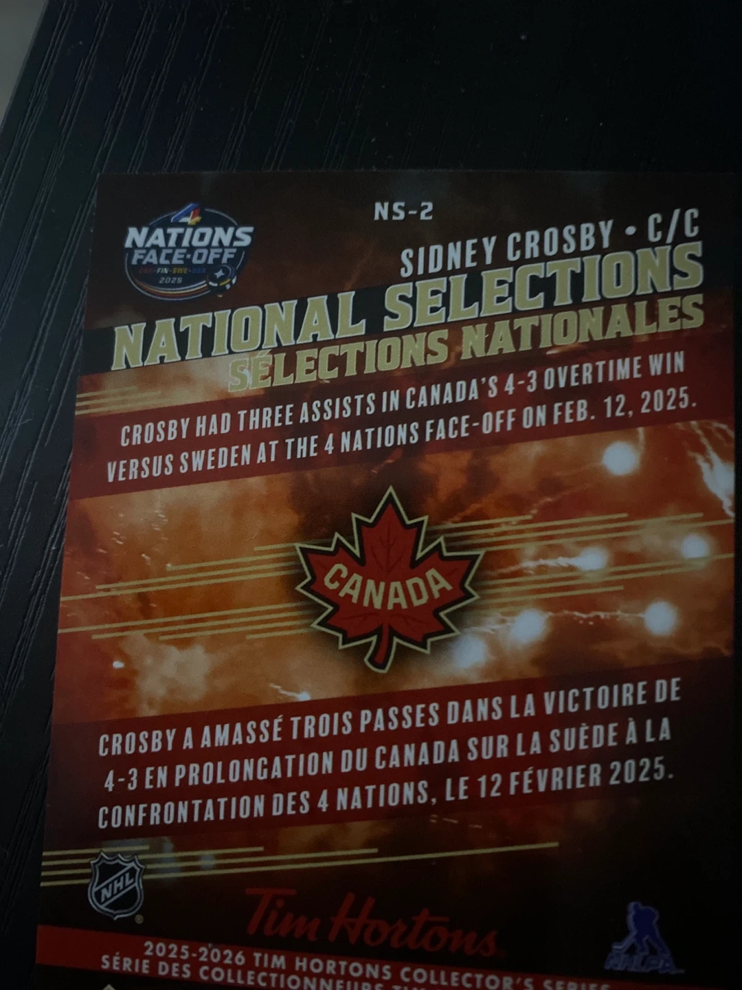This Upper Deck hockey card features Sidney Crosby from the National Selections. It commemorates Canada's 4-3 overtime win at the 4 Nations Face-Off on Feb. 12, 2025. This card is part of the 2025-2026 Tim Hortons Collector's Series.