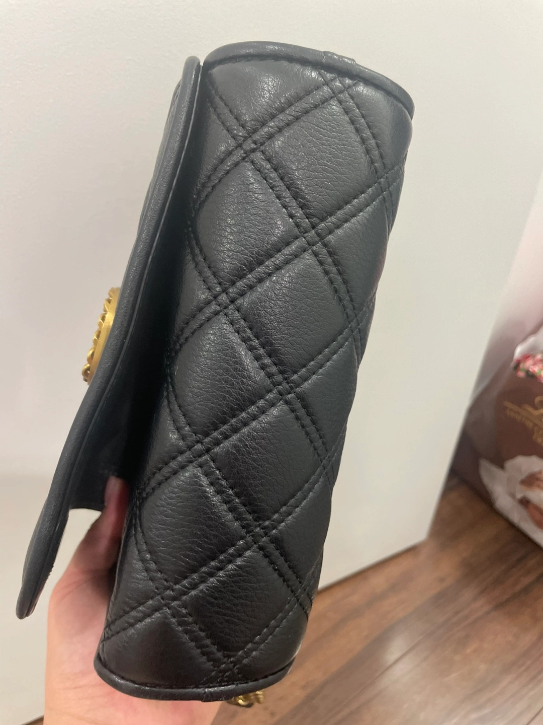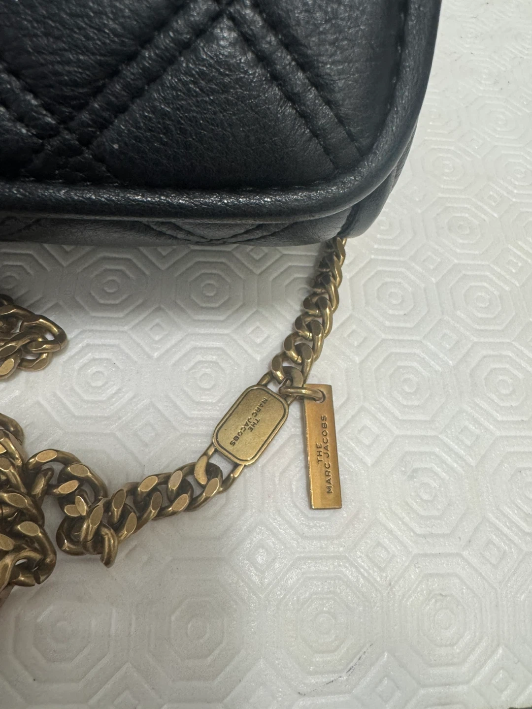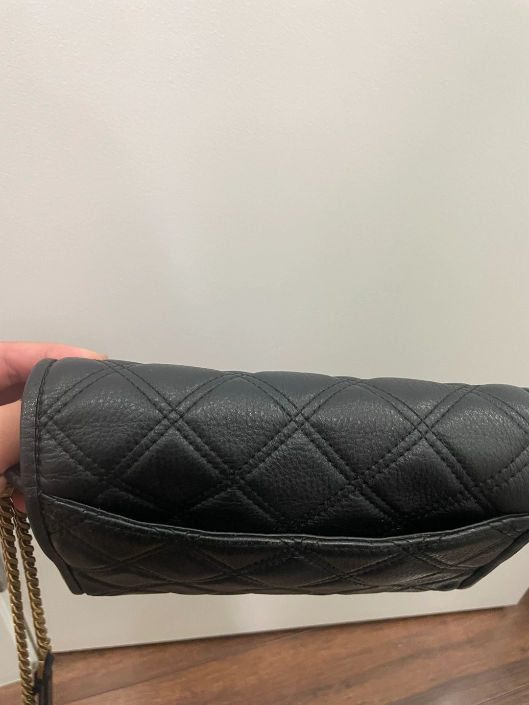 Selling a gently used Marc Jacobs crossbody bag in black leather. It features a quilted design and a gold chain strap. Perfect for everyday use!