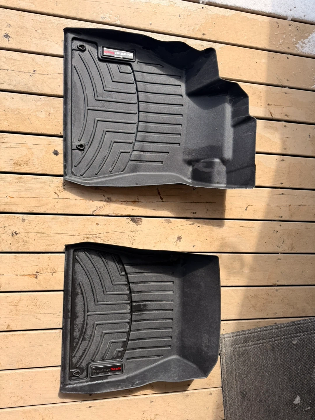 Pair of black WeatherTech FloorLiner floor mats for your Nissan Sentra 2021. These heavy-duty mats are made from a durable material to protect your car's flooring. They're designed to trap dirt and liquids, keeping your interior clean. Used only for a month, great quality.