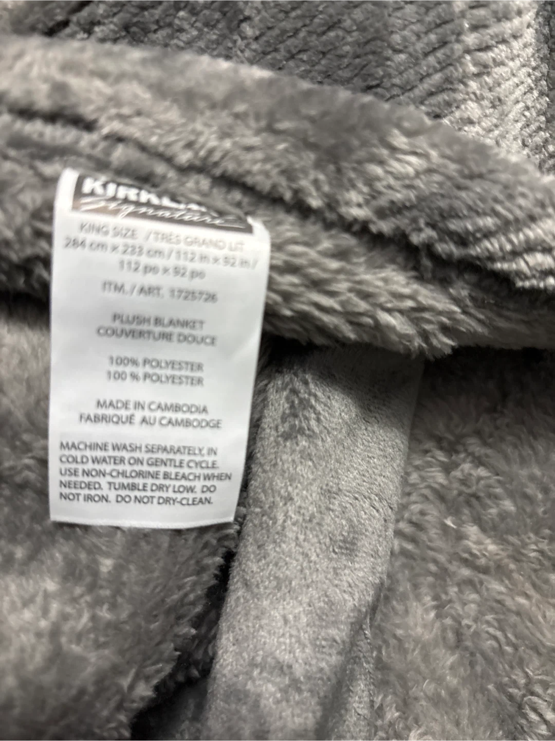 70Cozy up with this Kirkland Signature king-size plush blanket! It measures 284 cm x 233 cm (112 in x 92 in). Made of 100% polyester, it's super soft and perfect for those chilly nights
