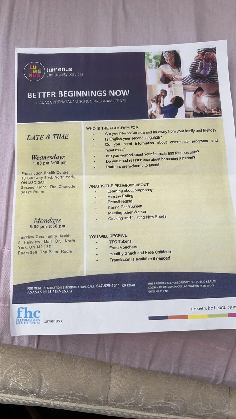 This flyer details the Better Beginnings Now program by Lumenus. It outlines who the program is for, its dates and times, and what participants will receive, including TTC tokens and food vouchers. Information on partnering community health centres is also provided.