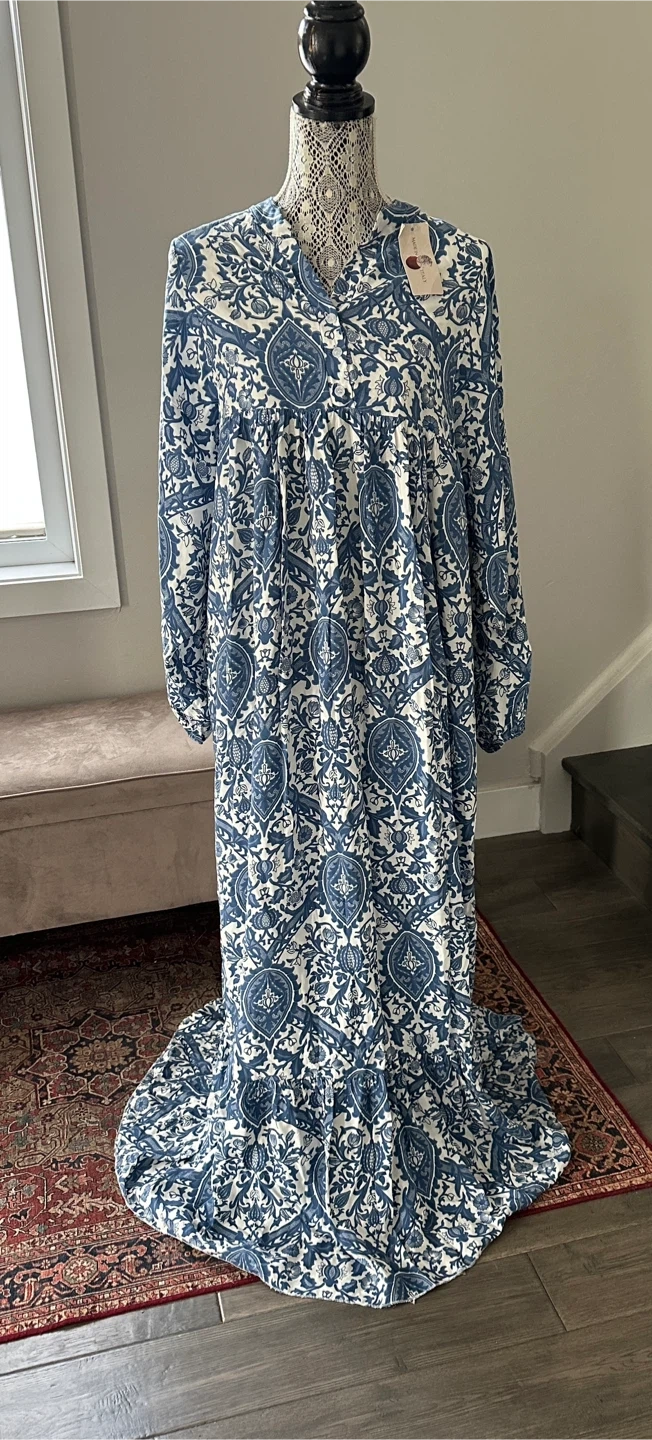 292This is a new with tags maxi dress! It features a lovely blue and white floral pattern and a comfortable, flowy fit Size is 25 inches across the chest and 56/58 inches in lenghth New - $30 Fastest pick up in East York- Greenwood/Sammon