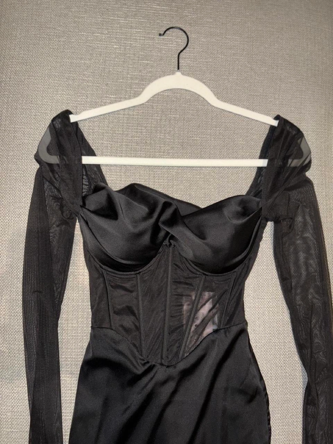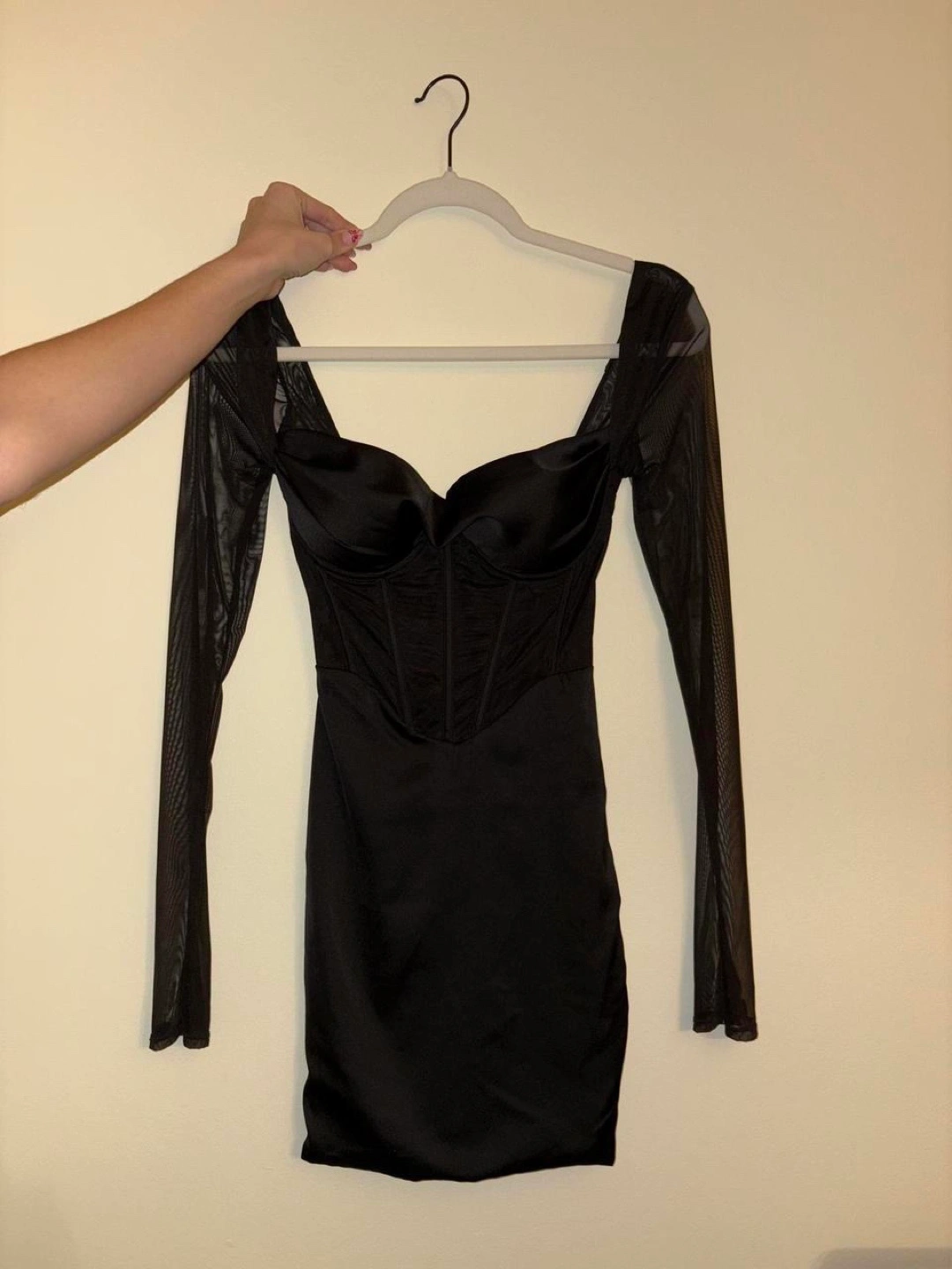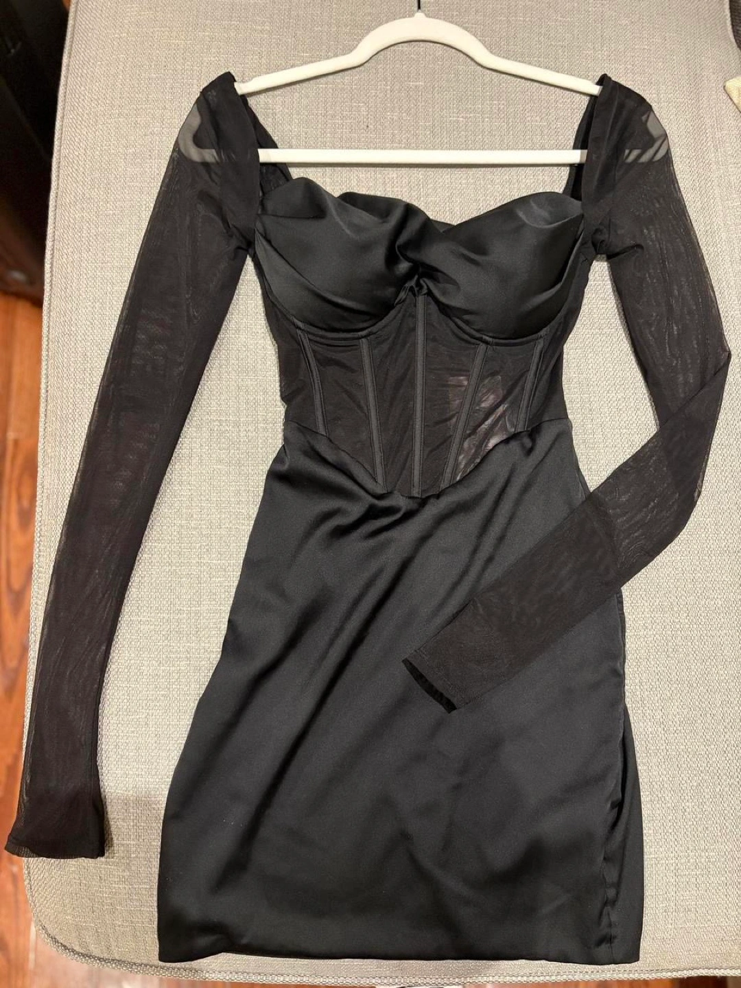 LORIENT dress on the website Women’s size UK 4, US 0 Fits women’s XXS to XS Details: - Underwired cups - Hidden zipper on reverse - Mini length, approx 83cm - Bodycon fit - Satin with mesh sleeves and corset New with tags, never been worn. Bought for NYE two years ago but never ended up wearing. Regular retail price: $120 including shipping and tax Reasonable offers are always welcome through the offer button 💕 Feel free to message me with any inquiries :))