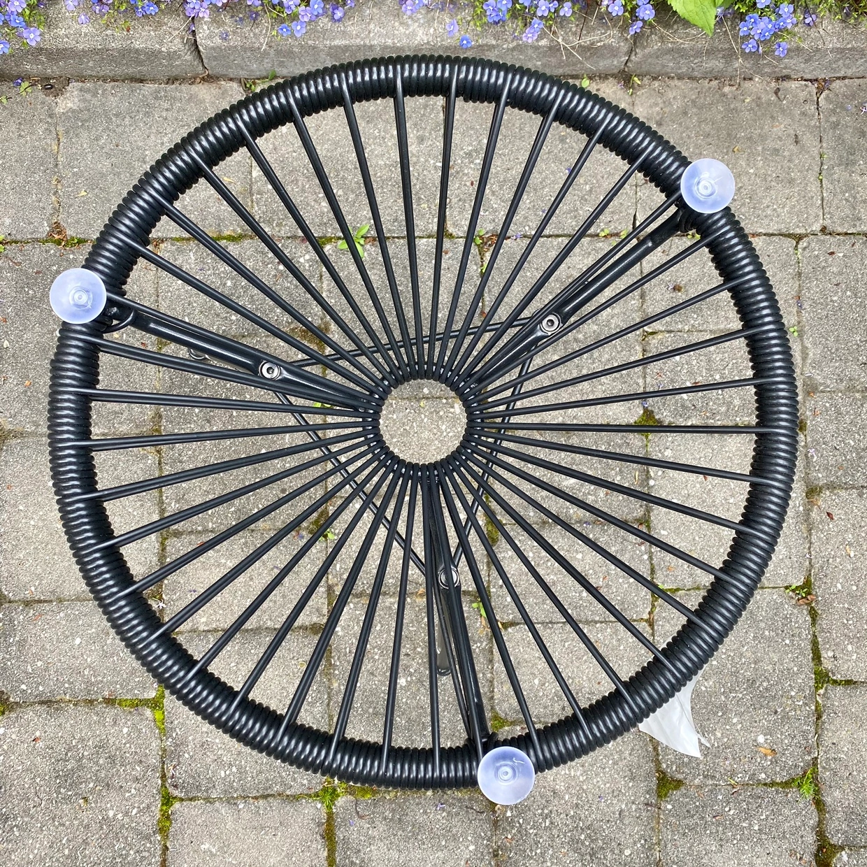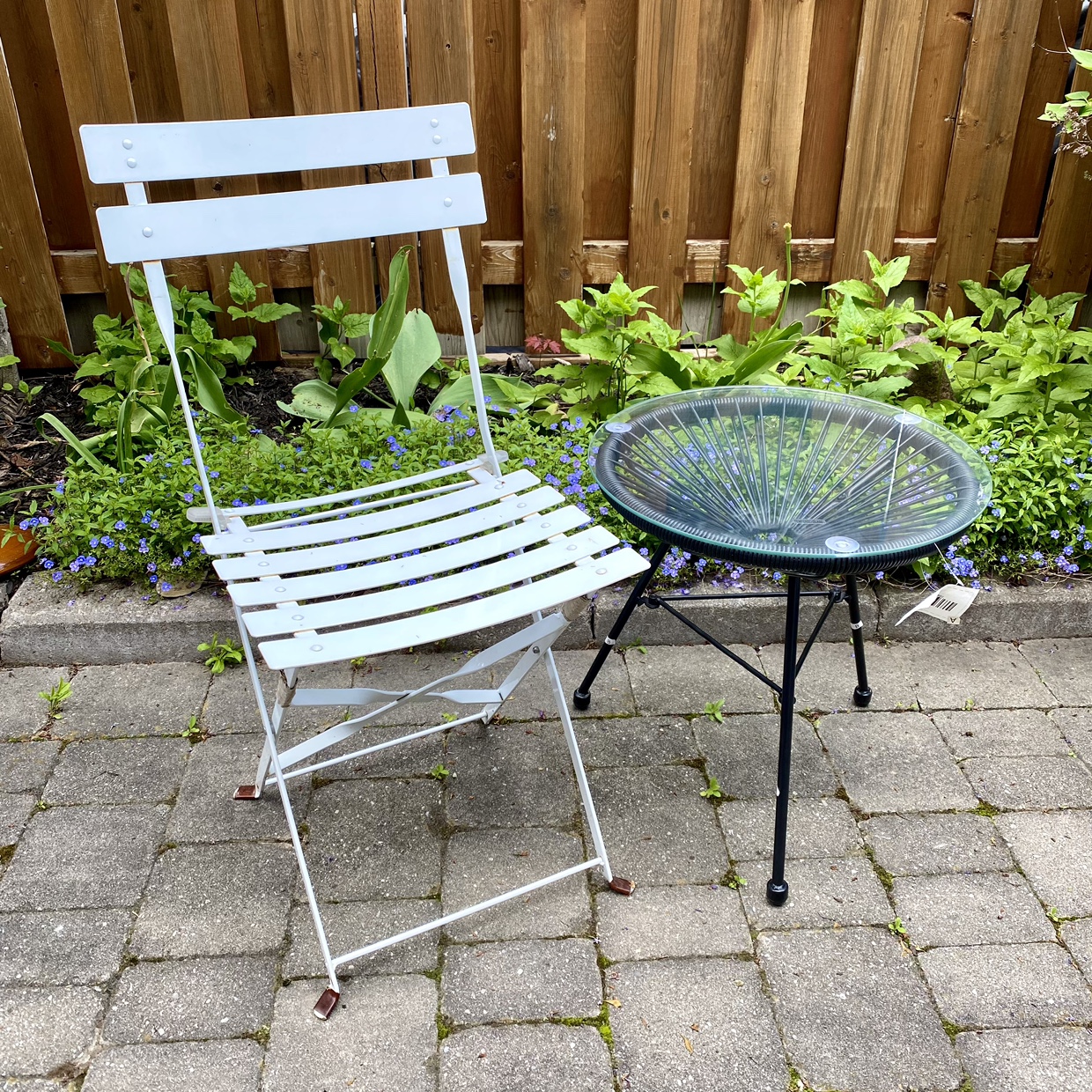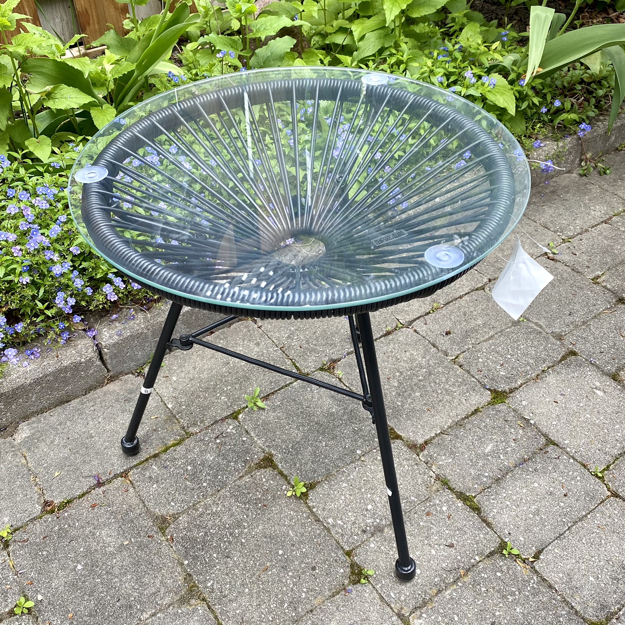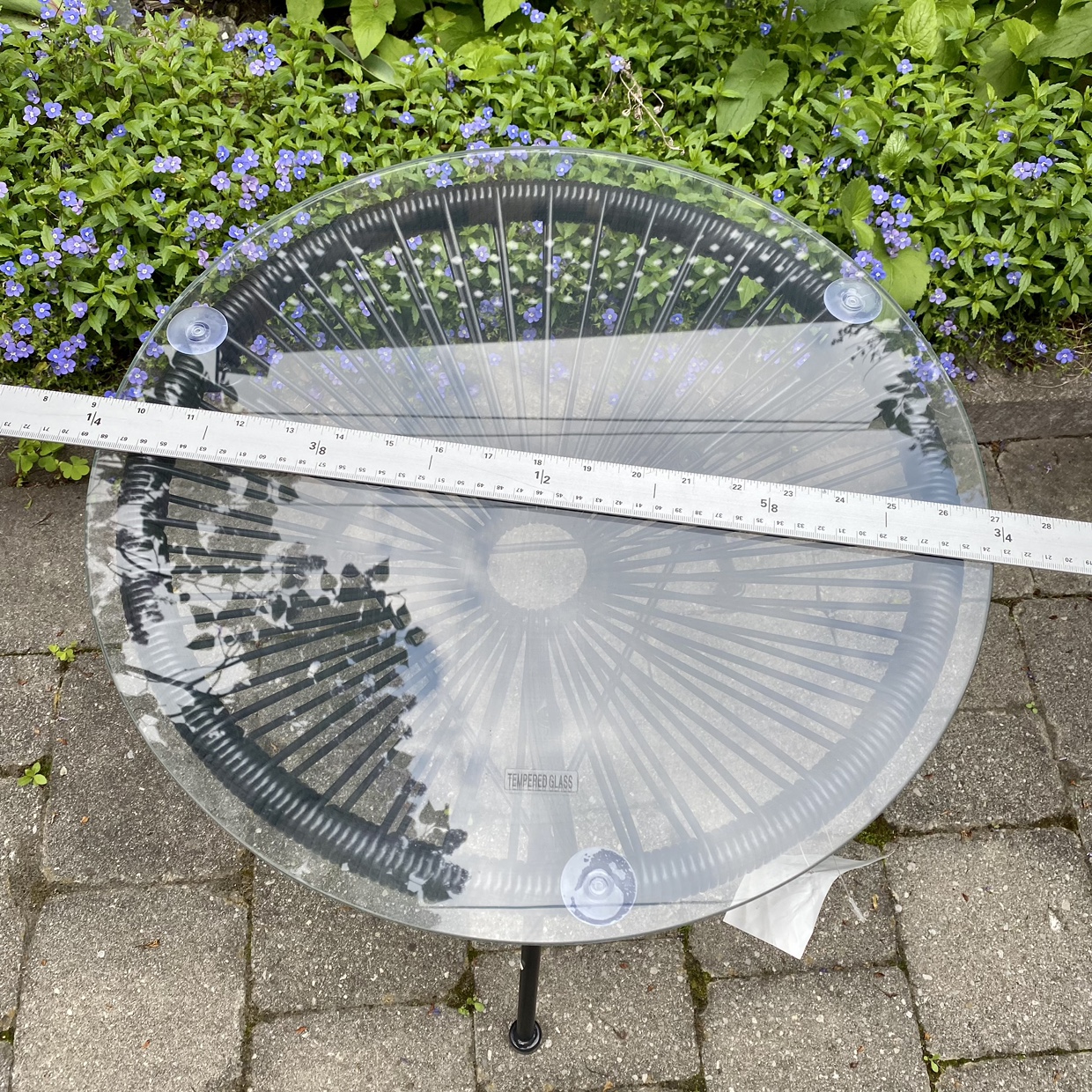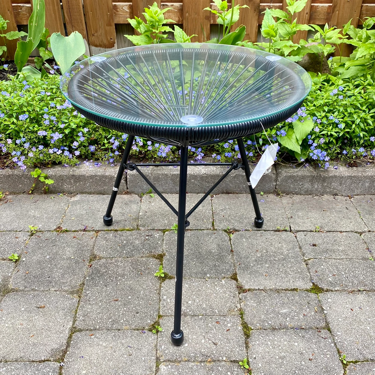 New with tag small round glass-top outdoor 3-legged side table with webbing. Top attaches with suction cups for cleaning. ~17.5βd x 18βh π₯$20 - chair not incl.