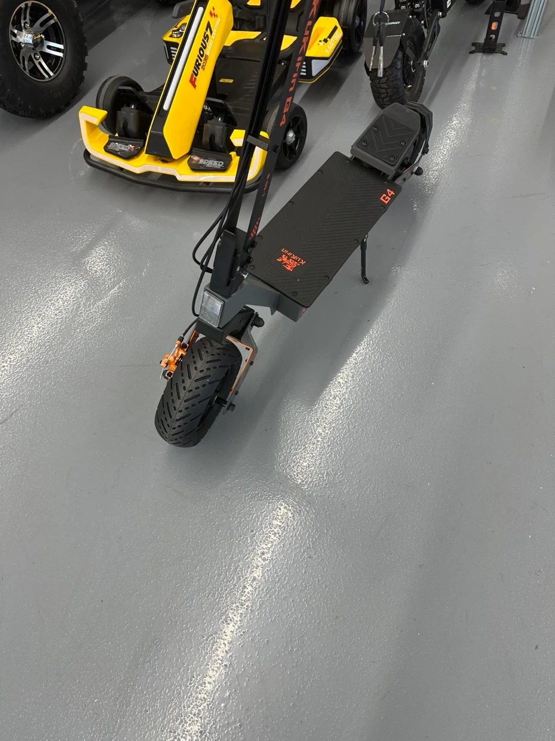 This is the Kukirin G4 electric scooter. It features a wide deck with textured grip tape. The front tire is rugged for better traction. Its top speed is about 43MPH/70KM/H. It has 2000 watts and only has around 400 KM.