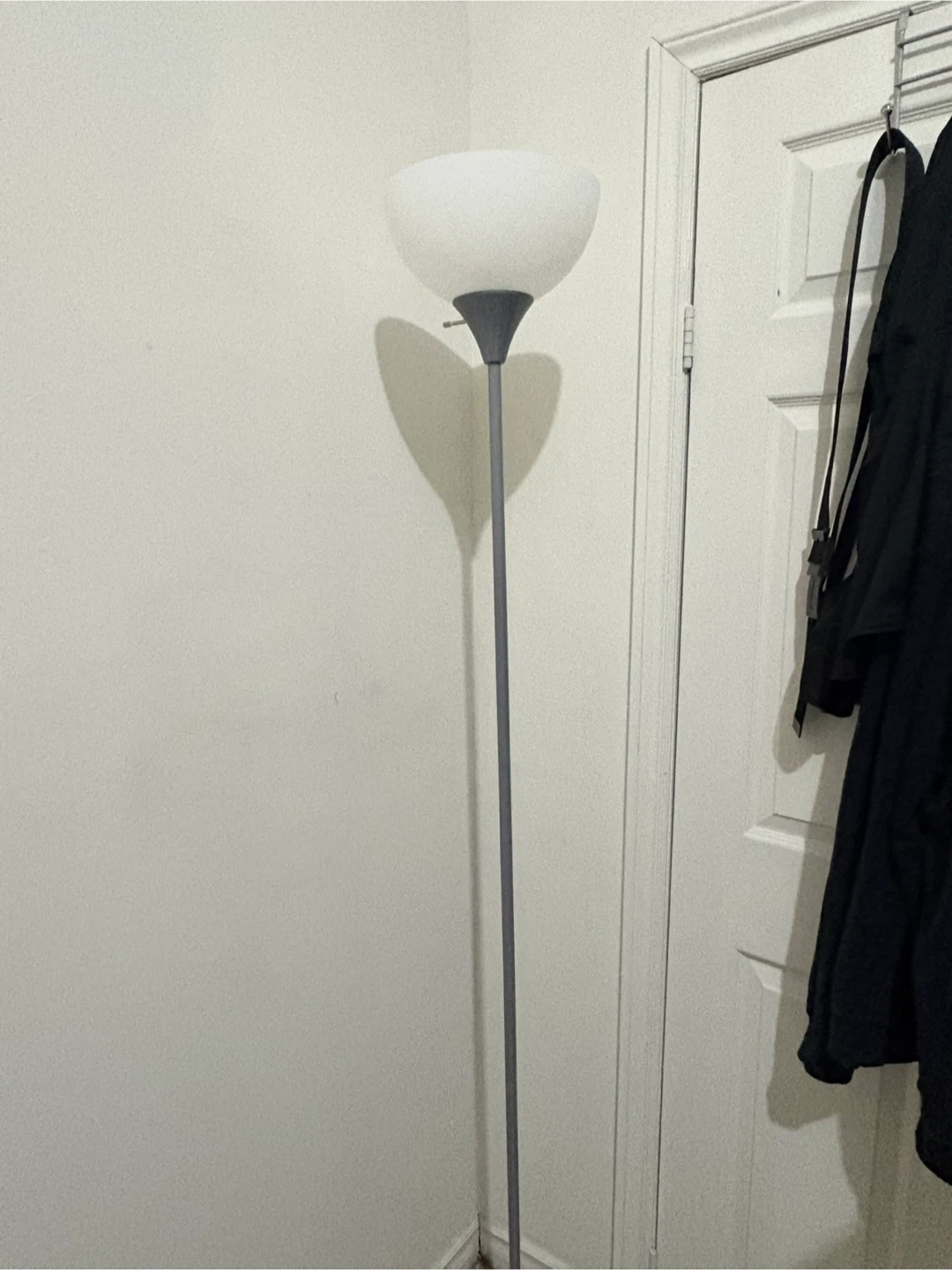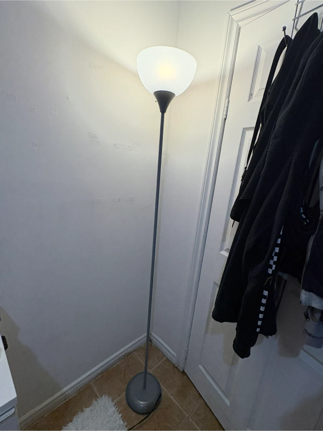 A sleek floor lamp with a grey metal pole and a frosted globe shade. It's perfect for adding ambient lighting to any room. Lamp stands tall and provides a warm glow.