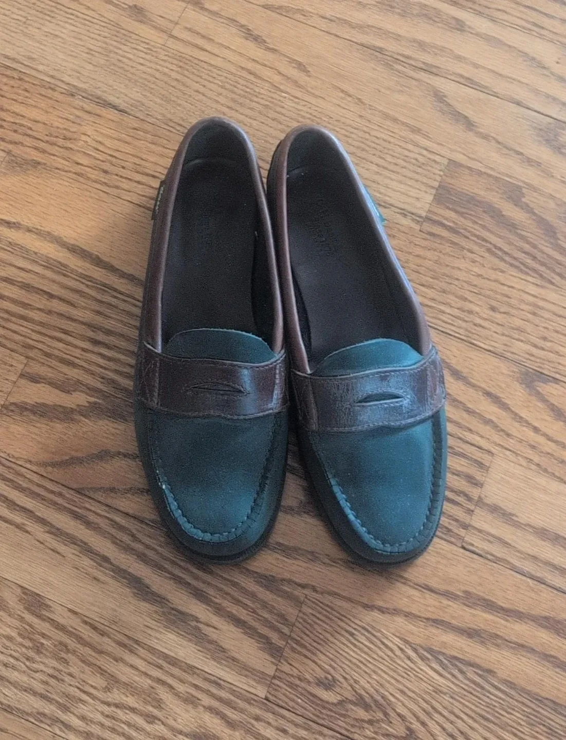 These Sebago loafers are a stylish brown and teal colour. They're made of suede and leather. These shoes are great for casual wear or dressing up an outfit!