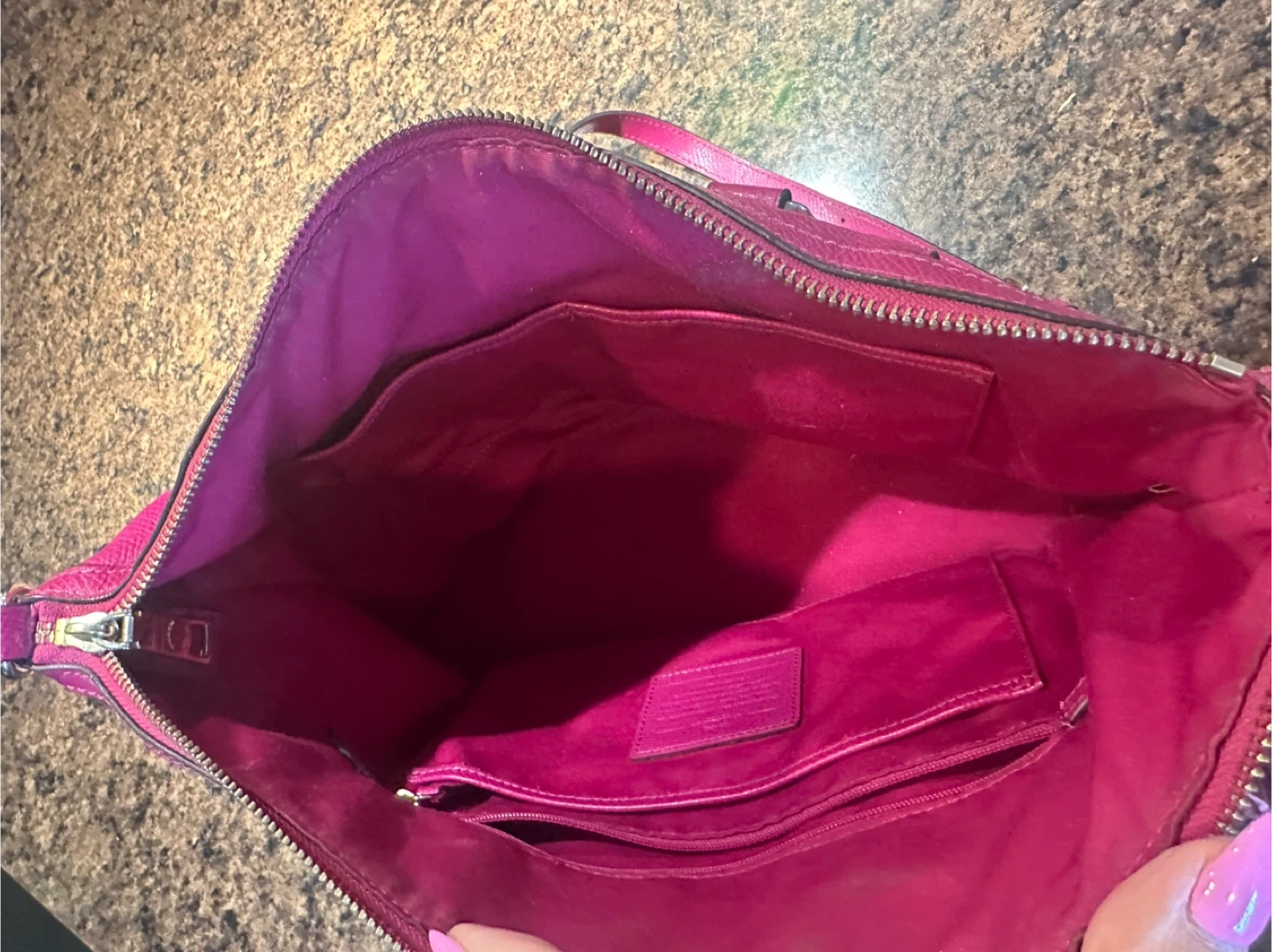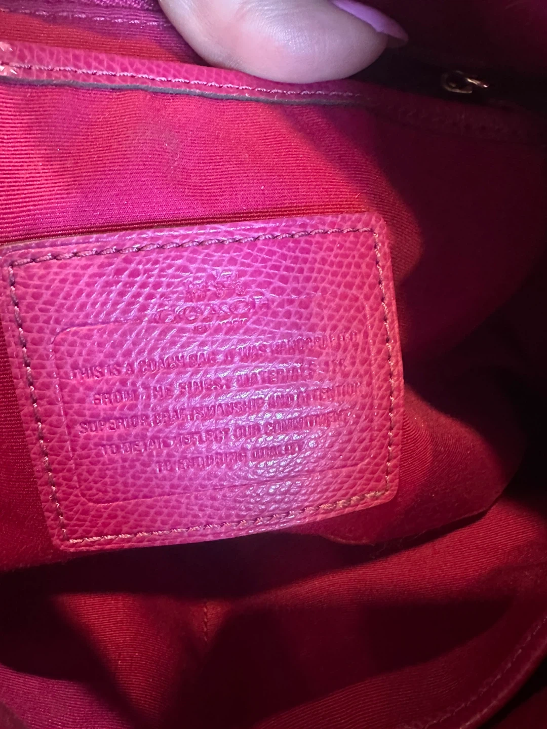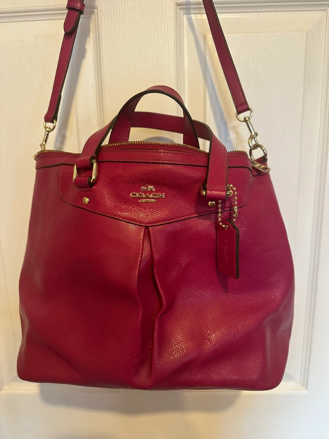 This is a Coach satchel handbag in a vibrant pink leather. It's made with genuine leather and features multiple interior pockets for organization. Includes a detachable crossbody strap for versatile wear.