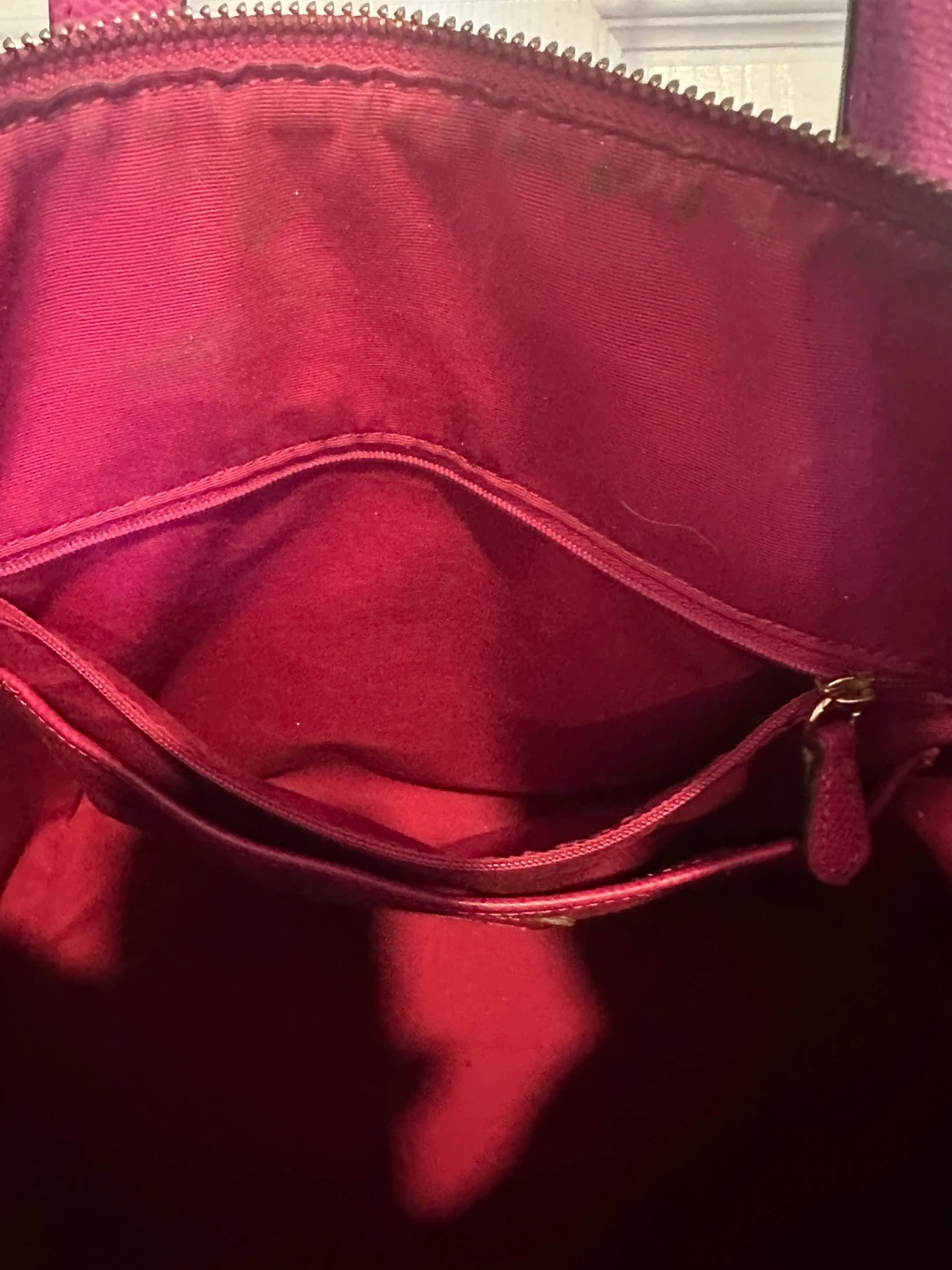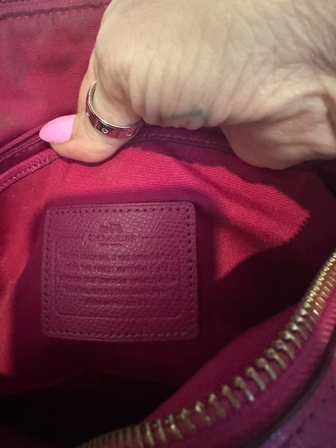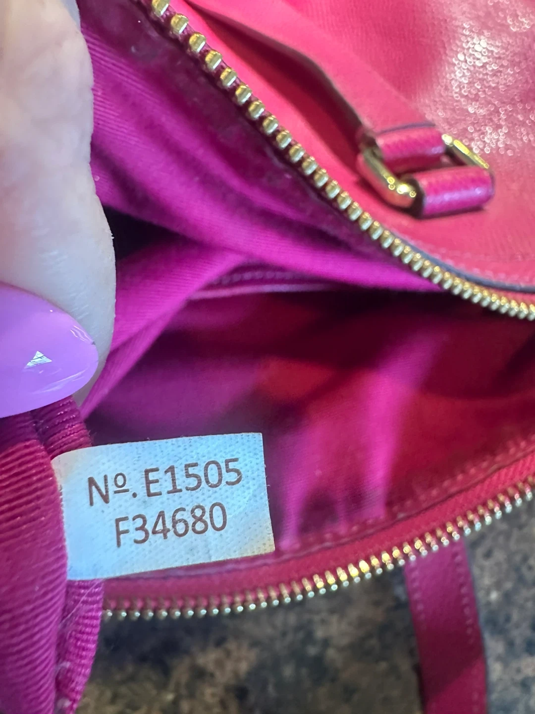 This is a Coach satchel handbag in a vibrant pink leather. It's made with genuine leather and features multiple interior pockets for organization. Includes a detachable crossbody strap for versatile wear.