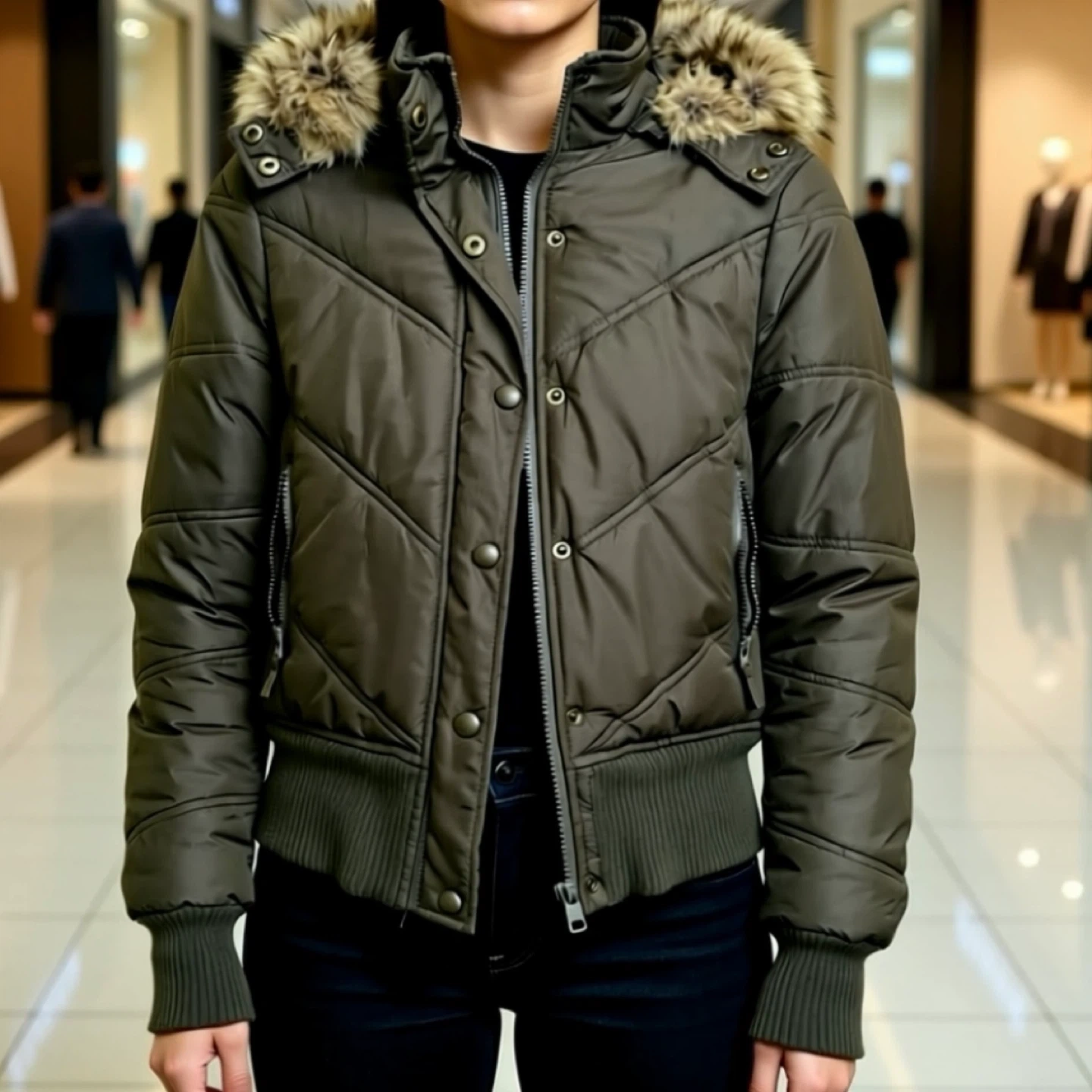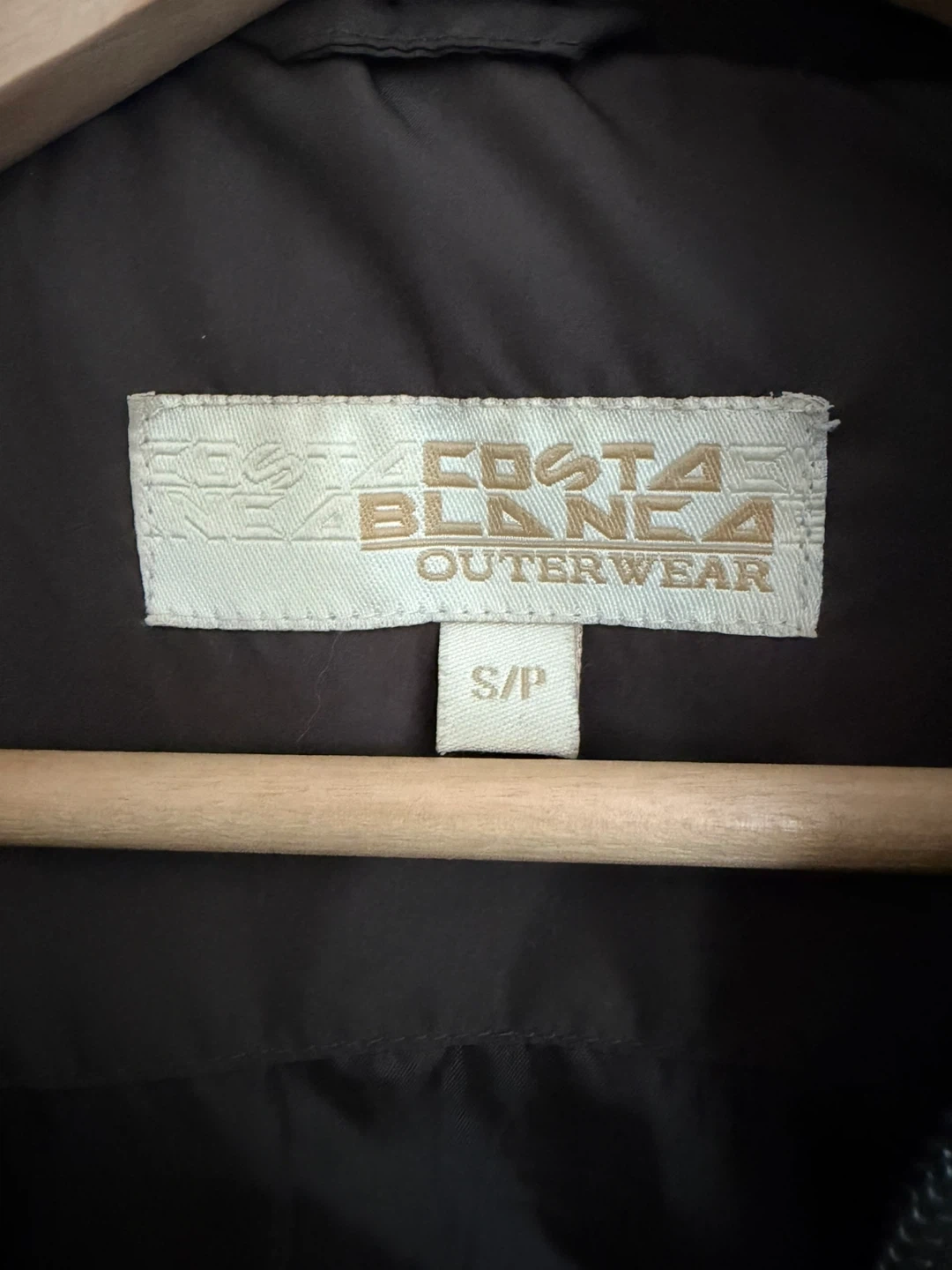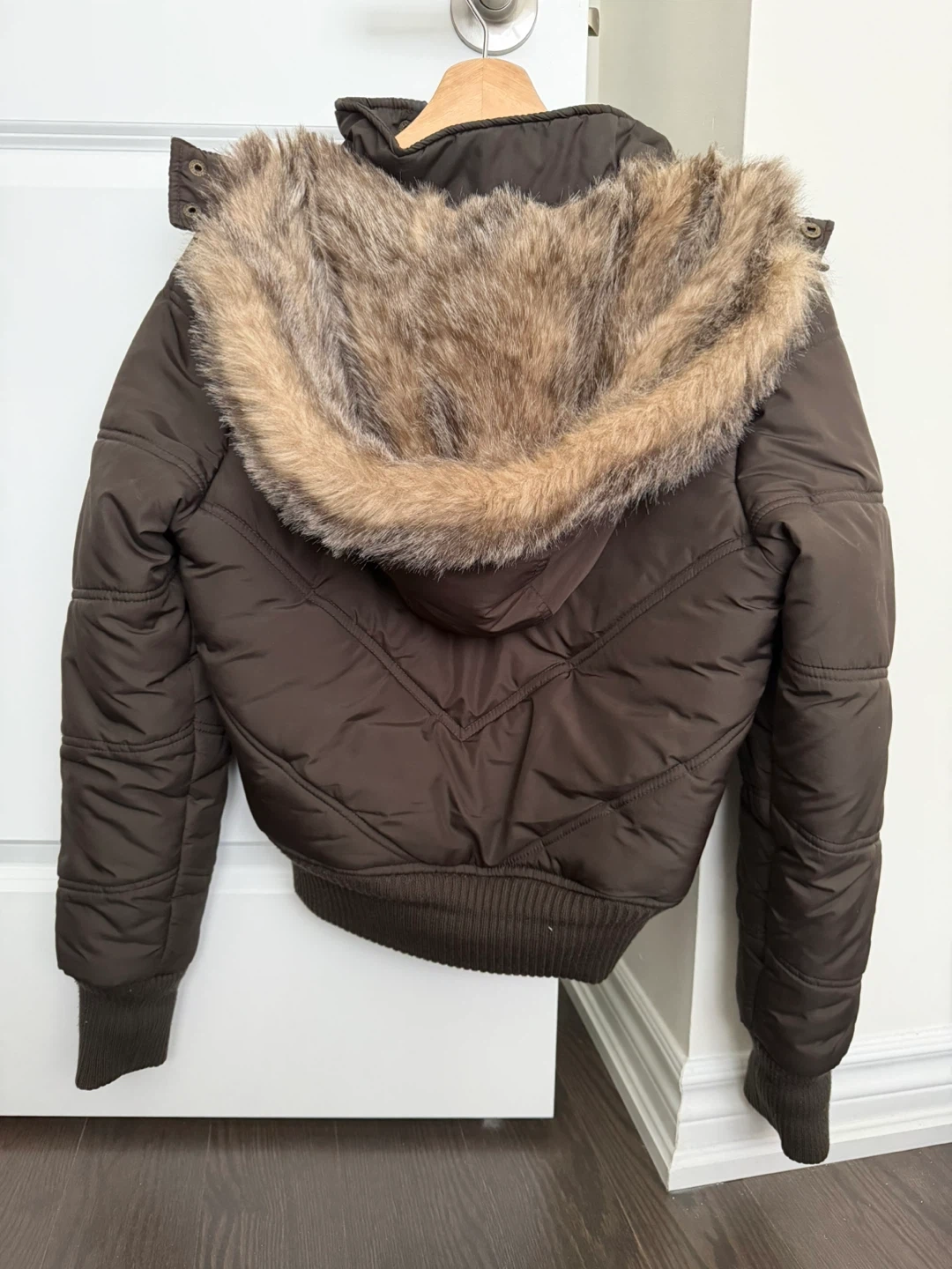 Here's a dark brown outerwear puffer bomber jacket in size small. It's a stylish and warm jacket. The jacket features a faux fur-trimmed hood and a quilted design.
