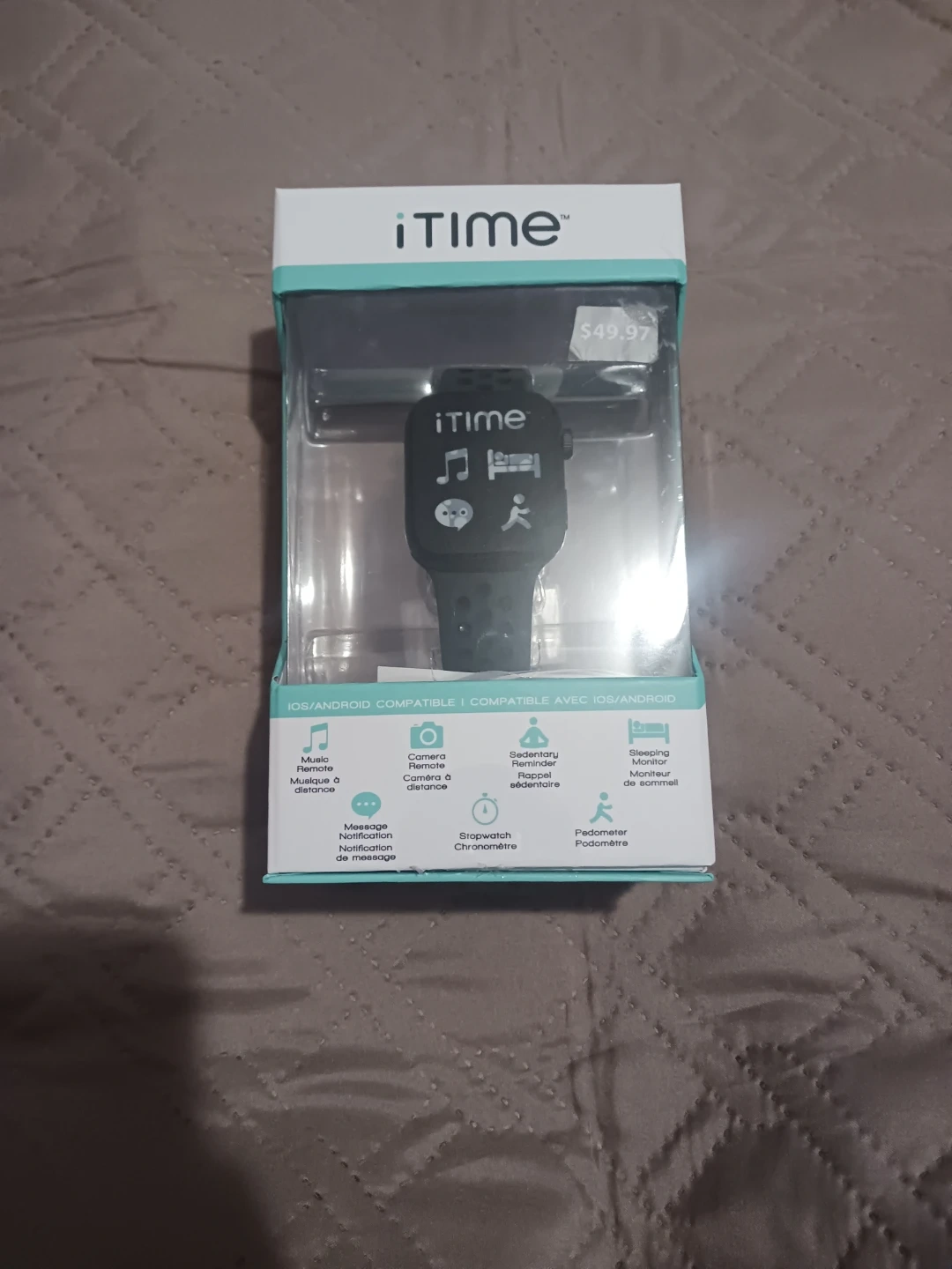 This iTIME smartwatch is the updated version compatible with iOS and Android devices. It supports music remote, camera remote, message notifications, pedometer, stopwatch, sedentary reminders, and sleep monitoring.