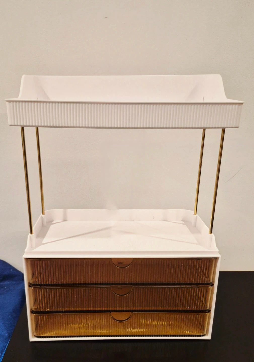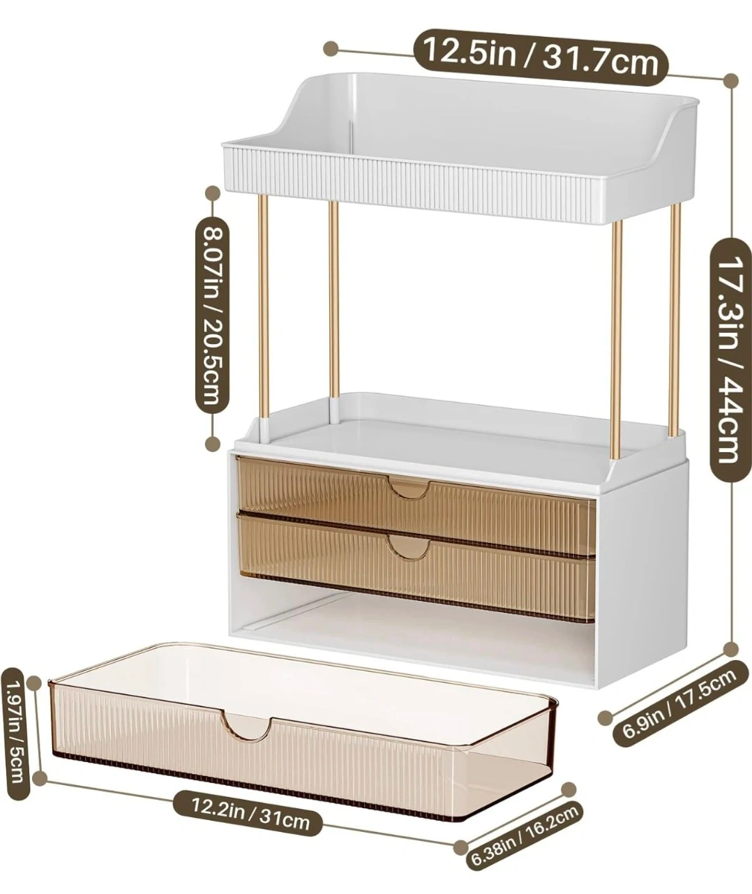 3 Drawers, 2 Tier Bathroom Vanity Organizer Office, Kitchen. Top shelf and three pull-out drawers with gold-tone support poles. Great for cosmetics or kitchen counter storage!