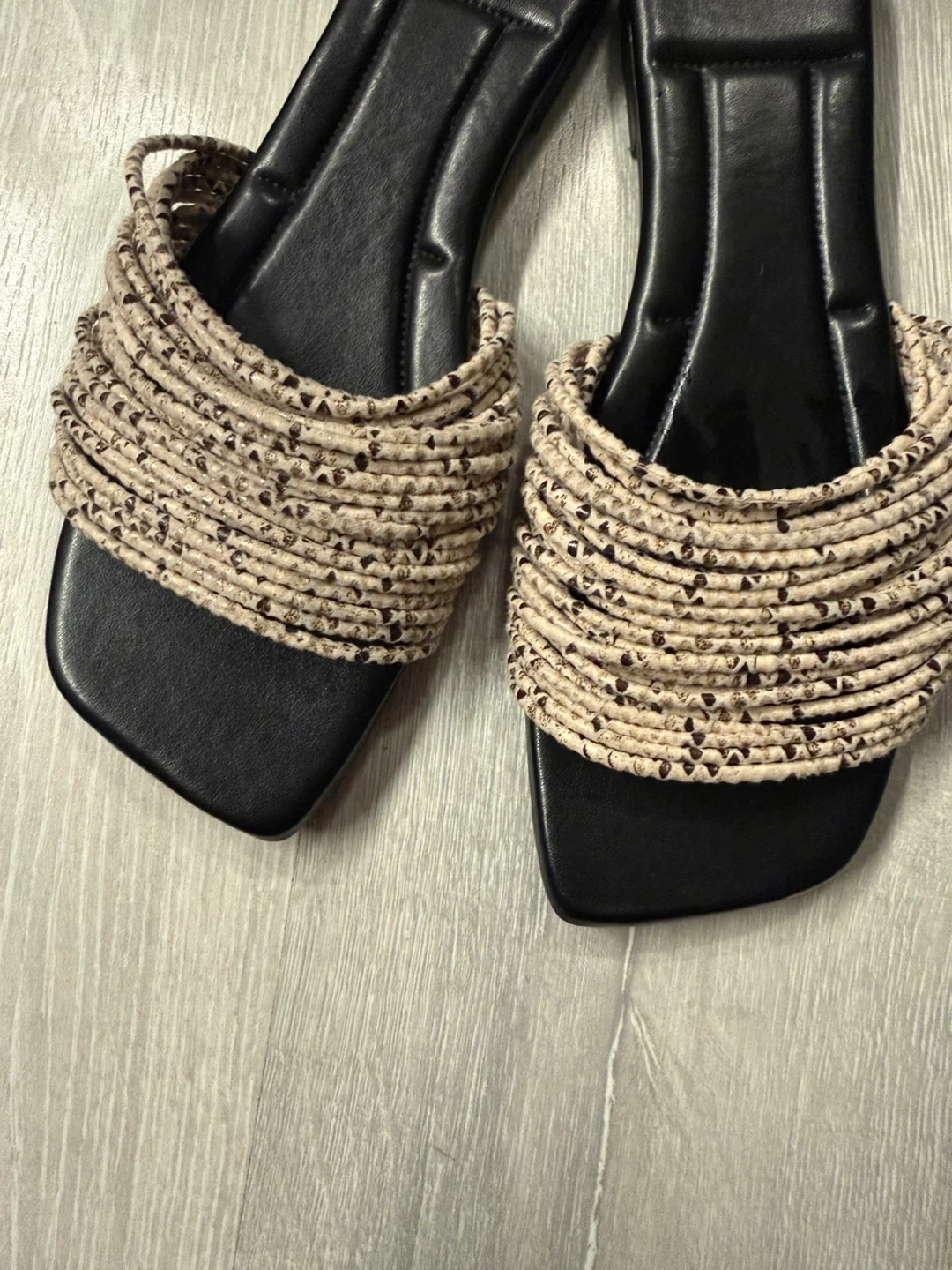 Marc Fisher LTD women's slip-on slide sandals. Features a woven strap detail and a square toe. These slides are great for casual wear!