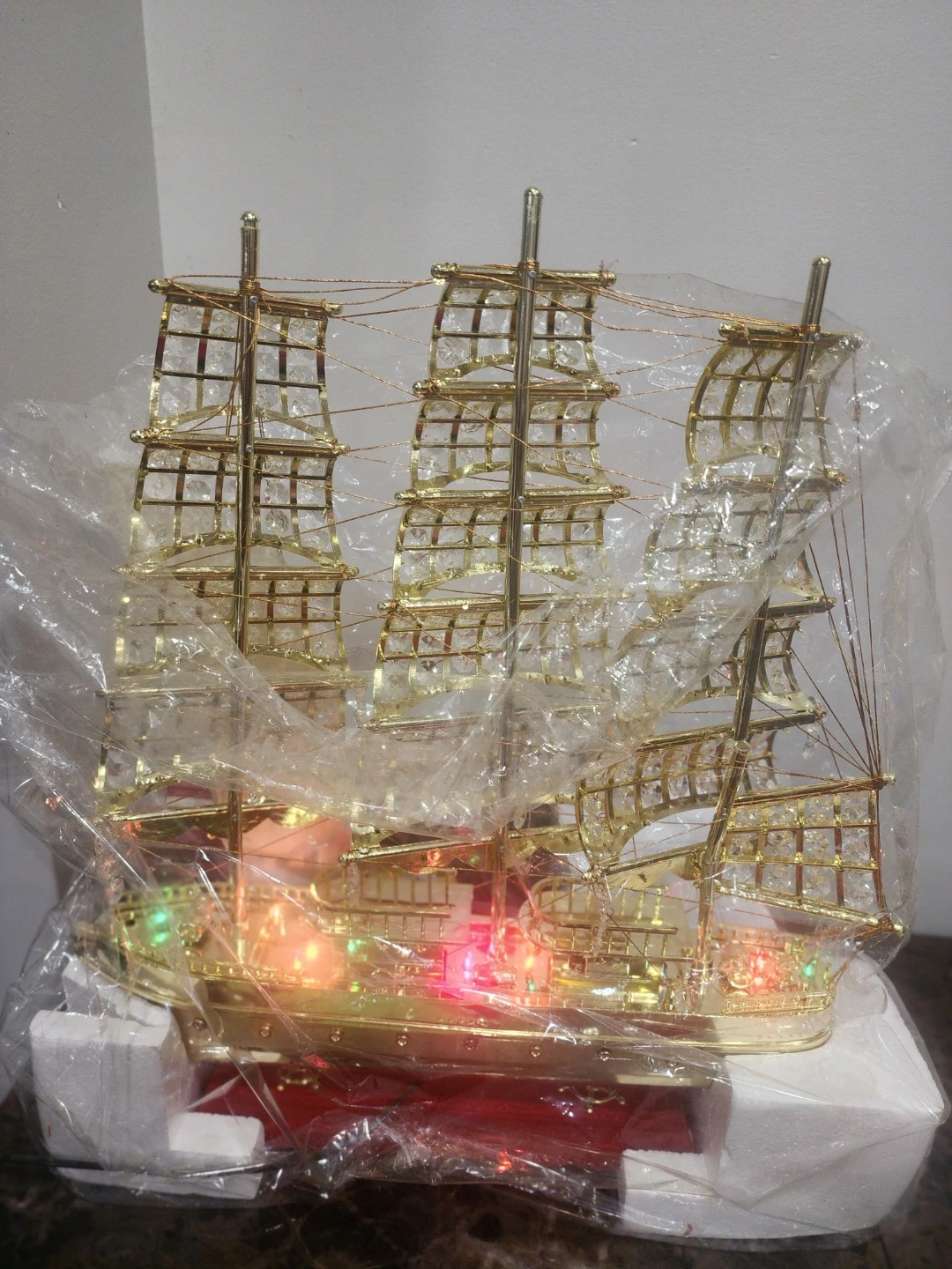 Selling a beautiful decorative gold ship model! It's still in its original packaging and looks brand new. Perfect for adding a touch of nautical charm to any room