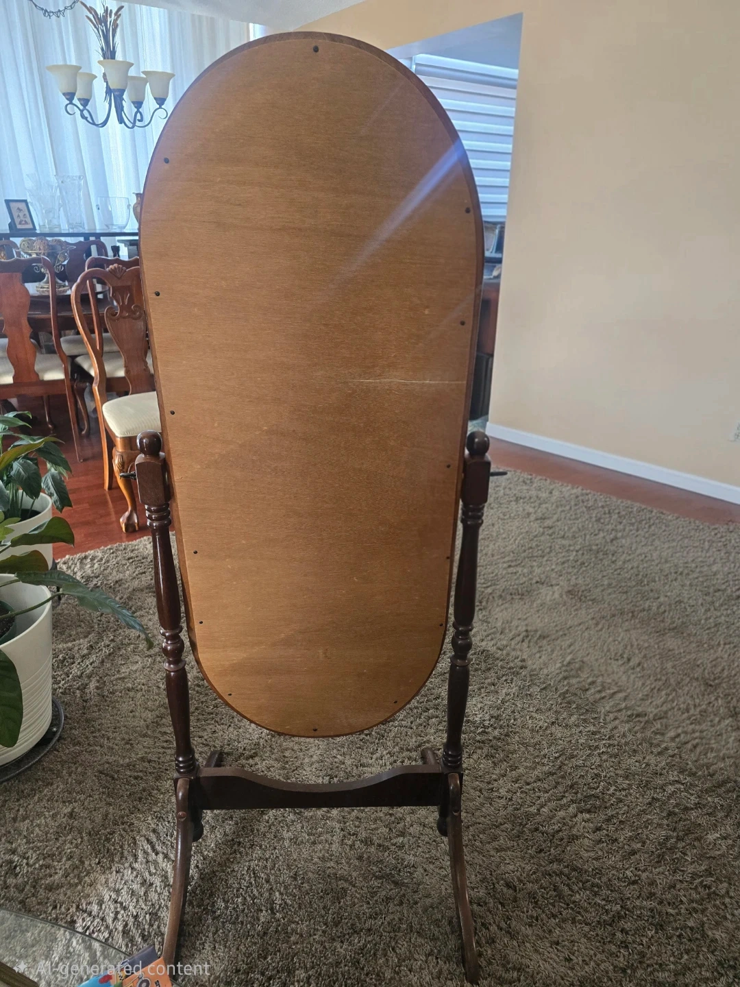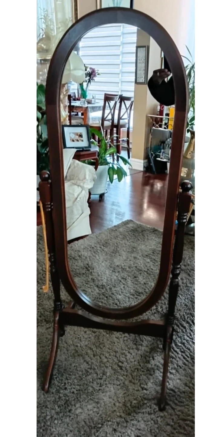 Wooden oval standing mirror. It's a floor-standing mirror with a dark wood frame. It'll look nice in a bedroom or dressing area!