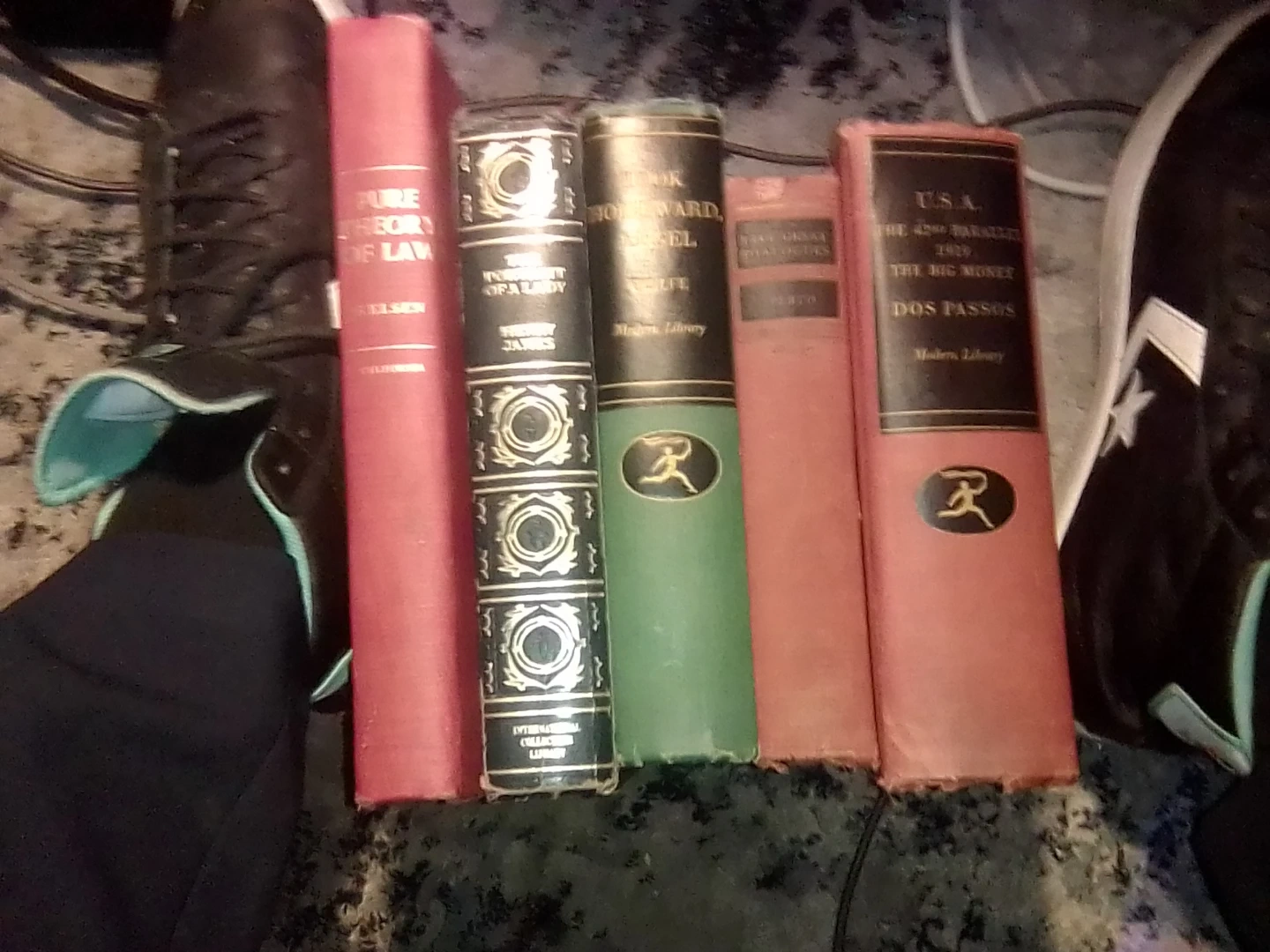 This collection includes five vintage books, all from the Modern Library edition. Titles include 'Pure Theory of Law,' 'The Portrait of a Lady,' 'Look Homeward, Angel,' 'Five Guests,' and 'U.S.A. The Big Money.' These editions feature decorative covers and are from various years.