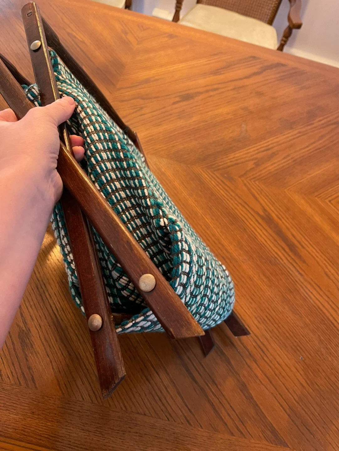 Wooden magazine rack with a woven fabric basket. It's got a classic X-frame design and a handy handle. The fabric is a green, white, and black pattern.
