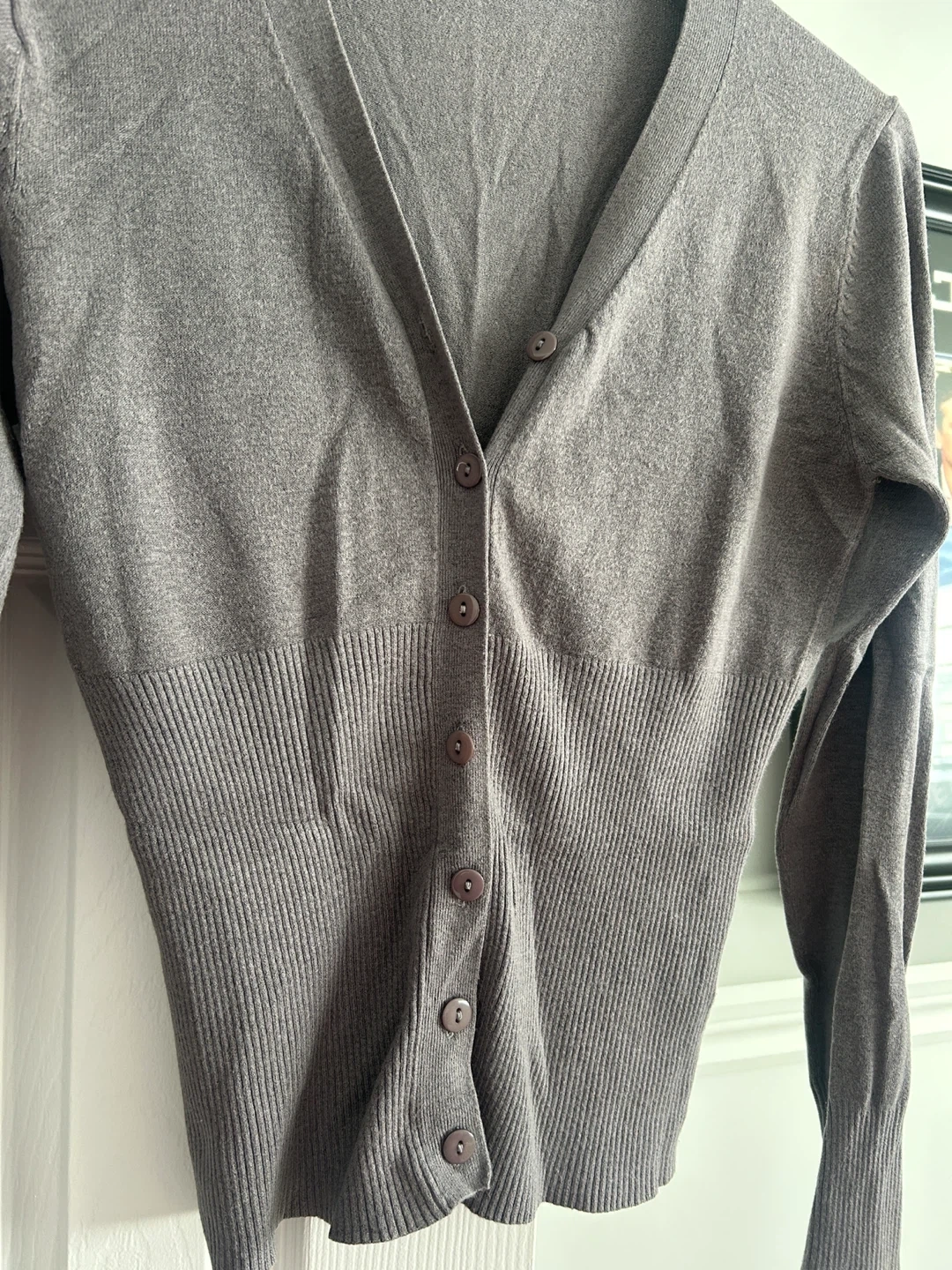 Selling a gently used grey cardigan sweater. It's in great condition and perfect for layering! The material is soft and comfortable. It has a classic button-down design.
