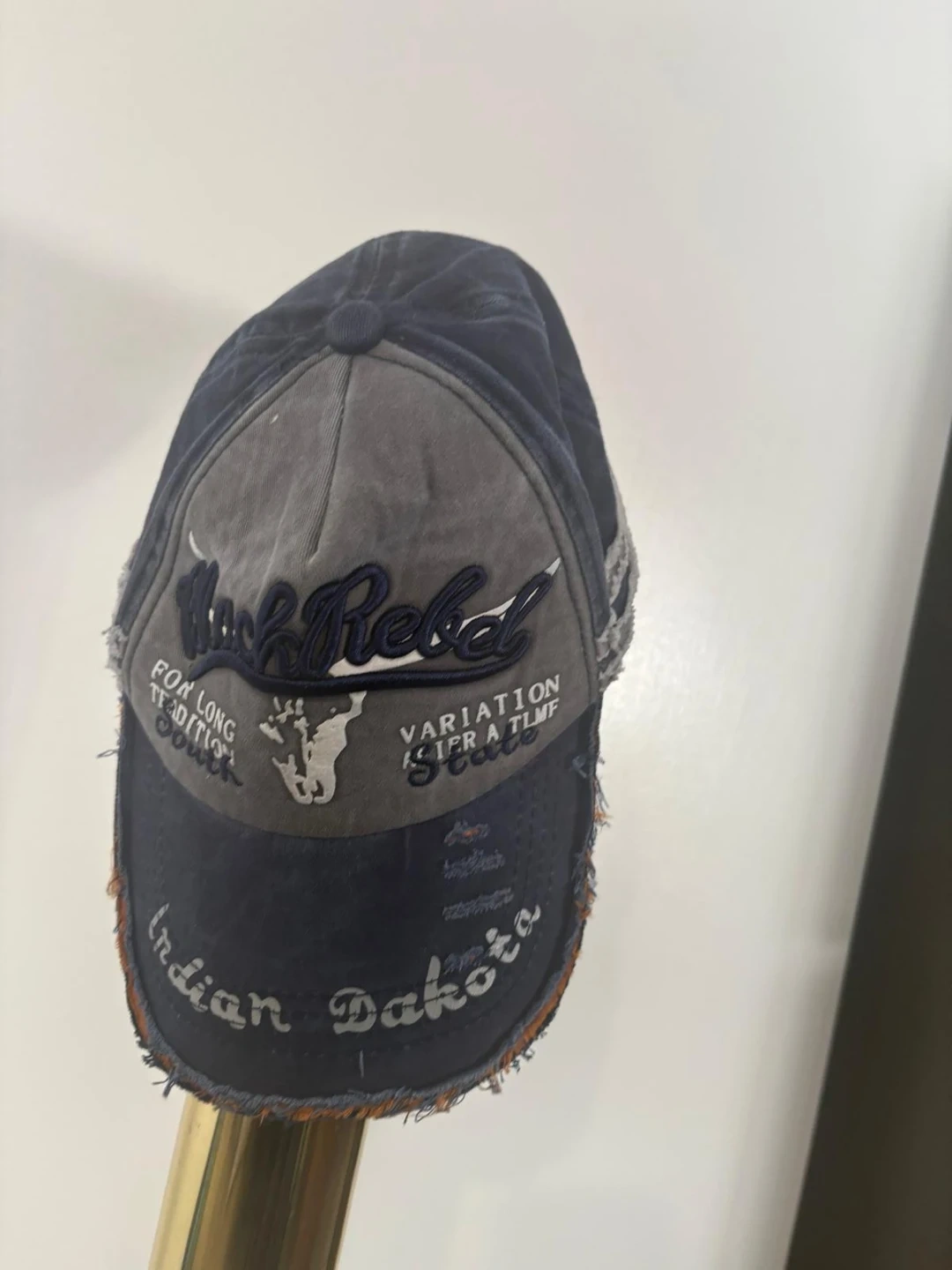 This is a "Black Rebel" baseball cap with "Indian Dakota" embroidered on the front. It features a distressed, washed denim look with grey and navy panels. The cap has an adjustable strap at the back.