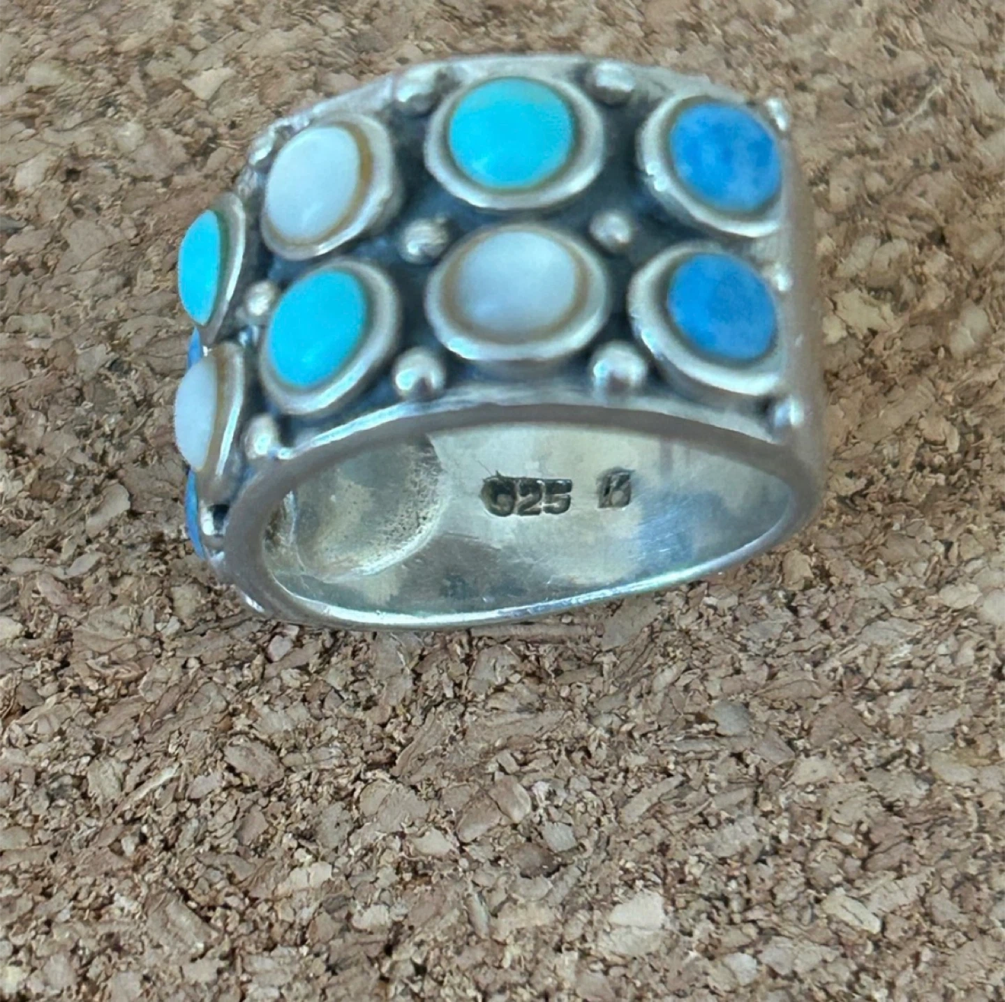 Preloved, solid sterling silver with coloured gemstones, with very nice weight to it, a very solid ring! Measures between size 6-6.5 on mandrel.