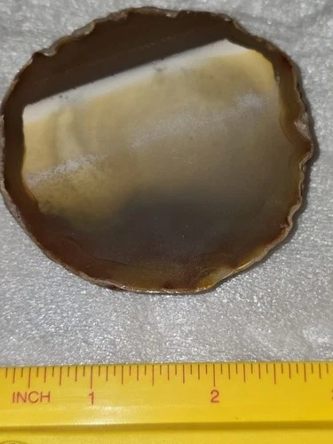 This is a polished agate geode half measuring 2.75 inches. It features maroon, yellow/brown, and white colors in a striking pattern. A great collectible item for rock and crystal enthusiasts.