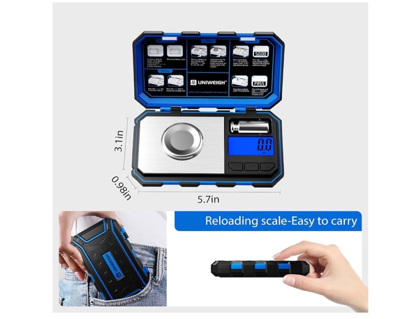 This UNIWEIGH digital scale is blue and comes in a protective case. It's a compact reloading scale that's easy to carry. The scale is rubber-coated, making it sturdy and durable. Includes a calibration weight pan.