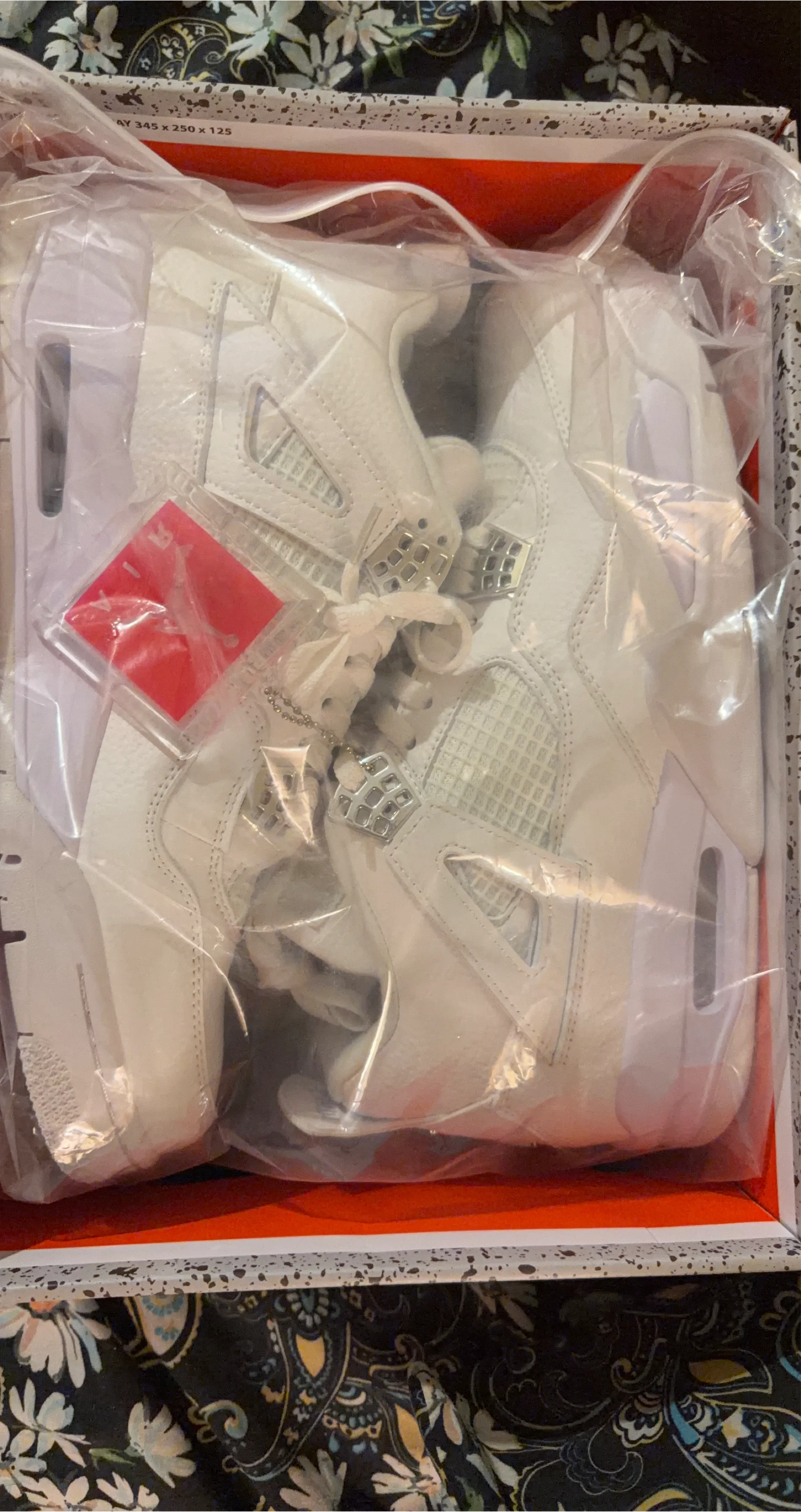Air Jordan 4 Retro sneakers in a clean white and metallic silver colorway. These shoes come in their original box. Size 11.5 US.
