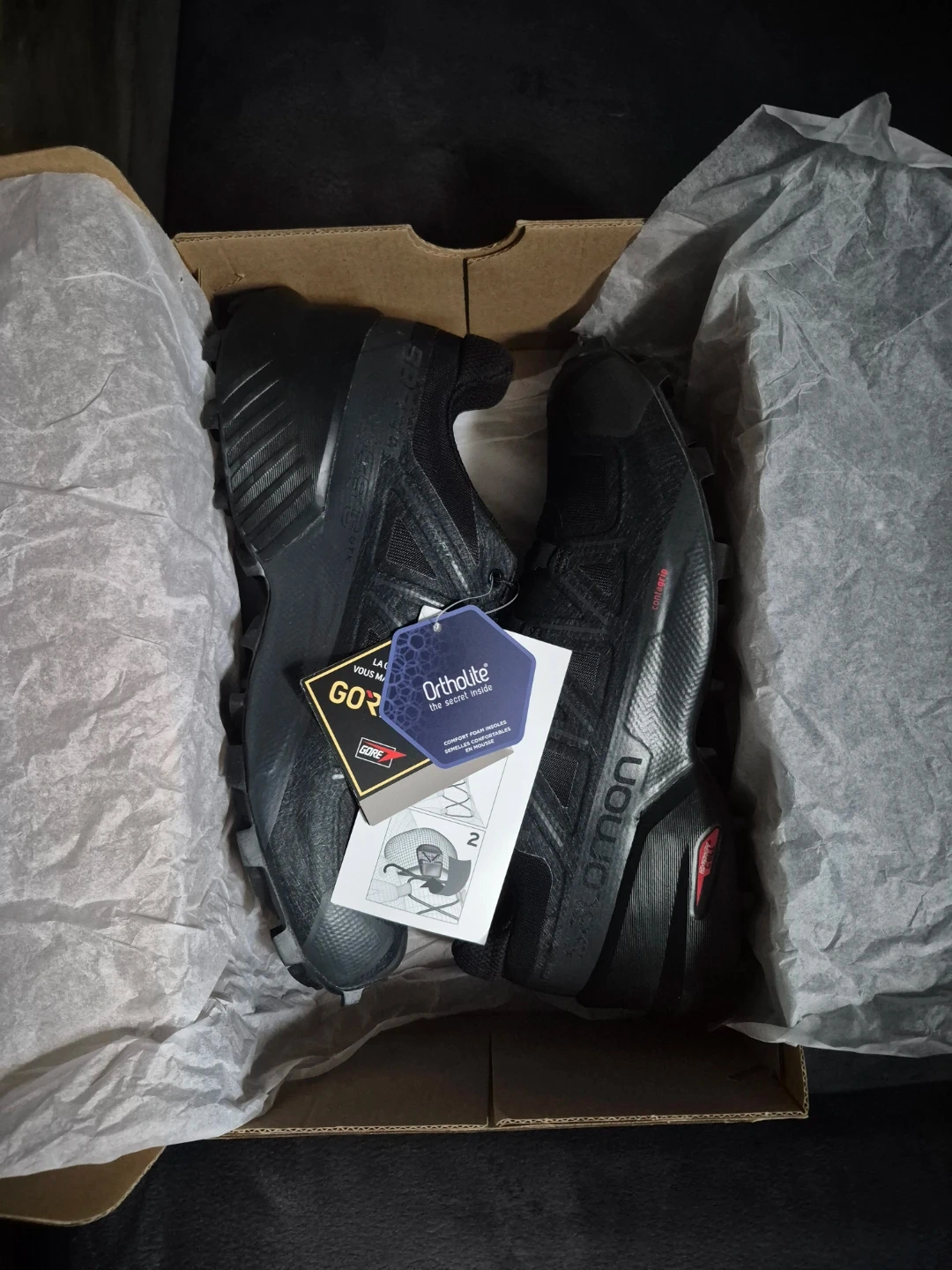 Black Salomon trail running shoes with GORE-TEX and OrthoLite insoles. These shoes are built for tough terrain. They're ready for your next outdoor adventure!