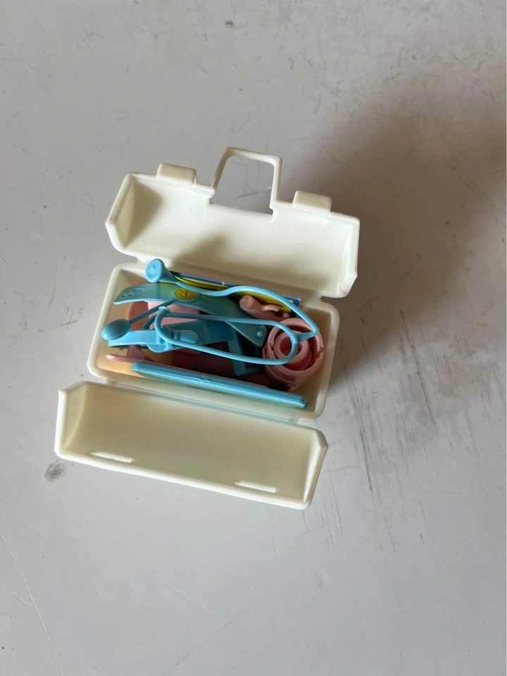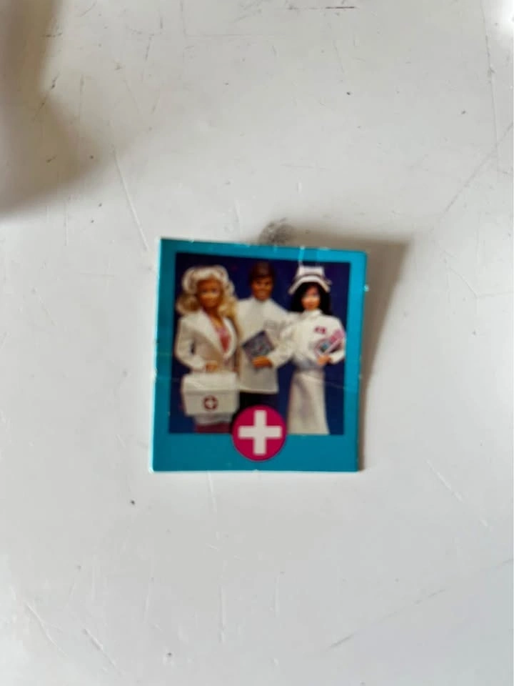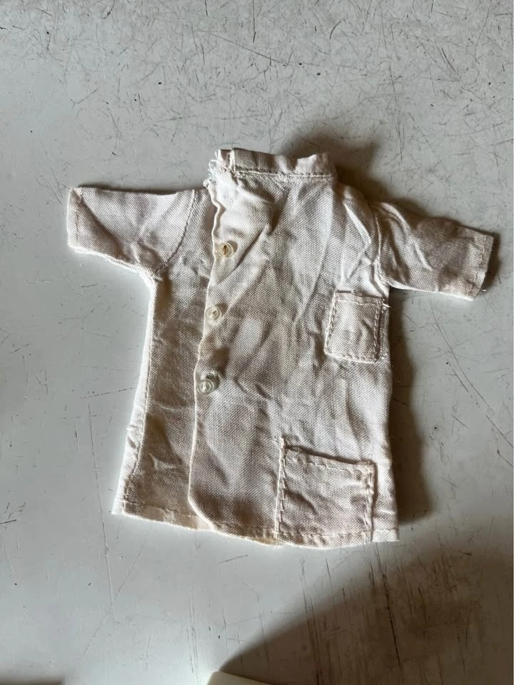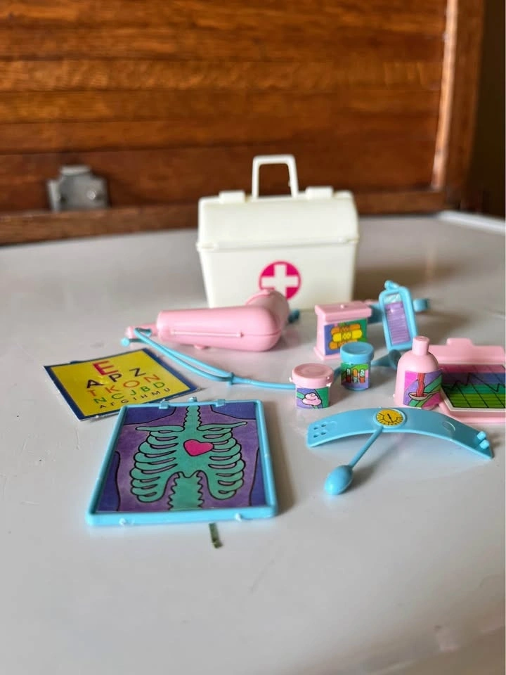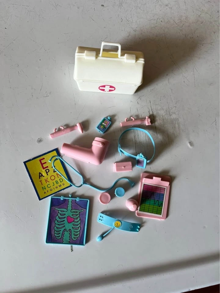 A fun set to add to your Barbie collection. It includes a lab coat and a doctor's bag filled with miniature medical items like a pill bottle, stethoscope, blood pressure monitor, and more. This is a complete set from the late 1970s.