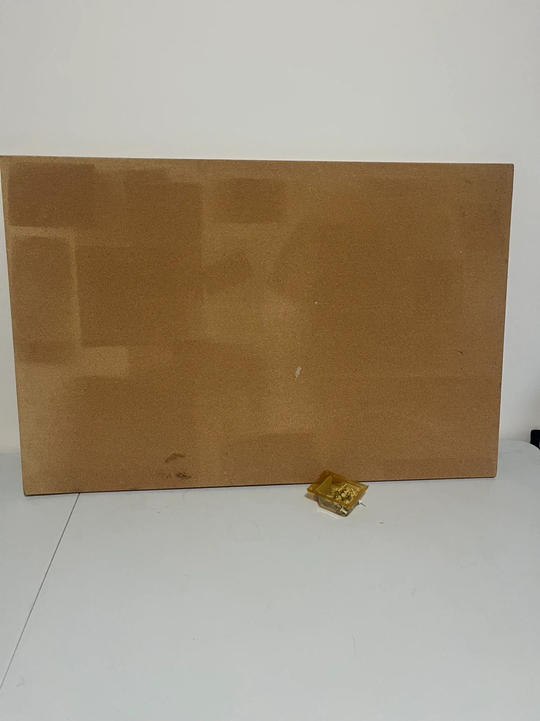 A standard cork bulletin board. It's made of cork material. This board is great for posting notes and reminders.