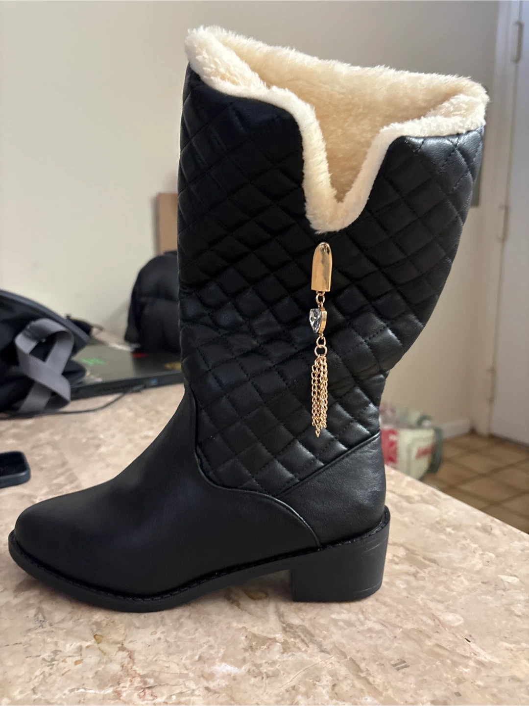These are a pair of black quilted winter boots with a soft, warm lining! They have a cute gold chain detail. Perfect for keeping your feet cozy and stylish during the colder months!