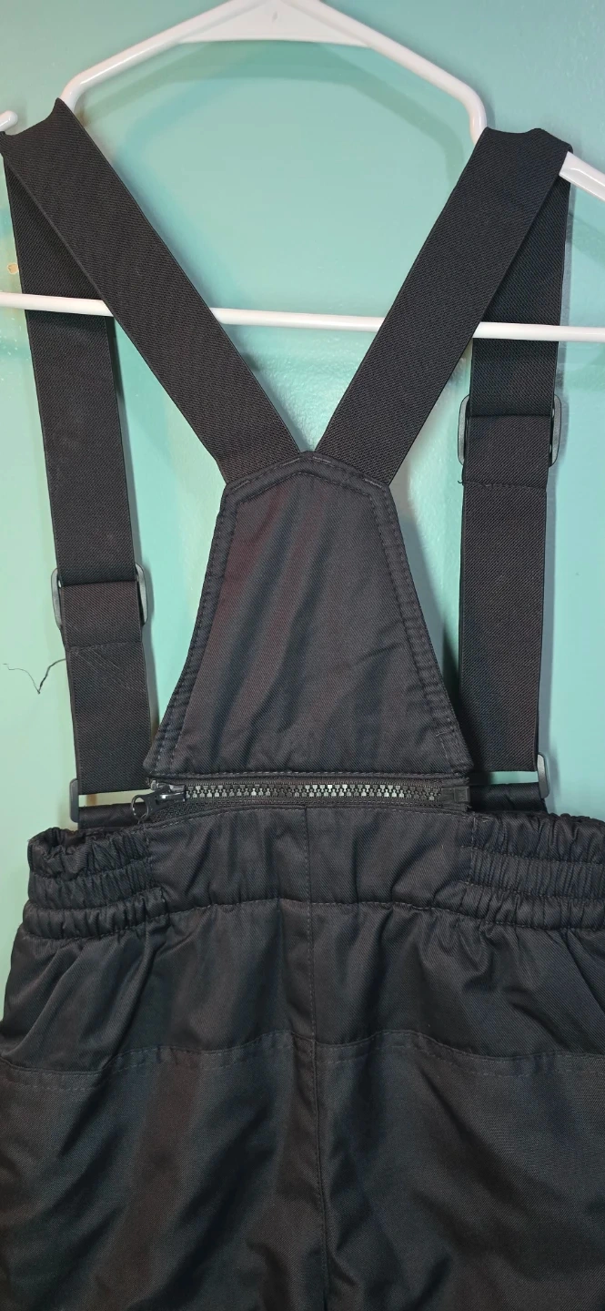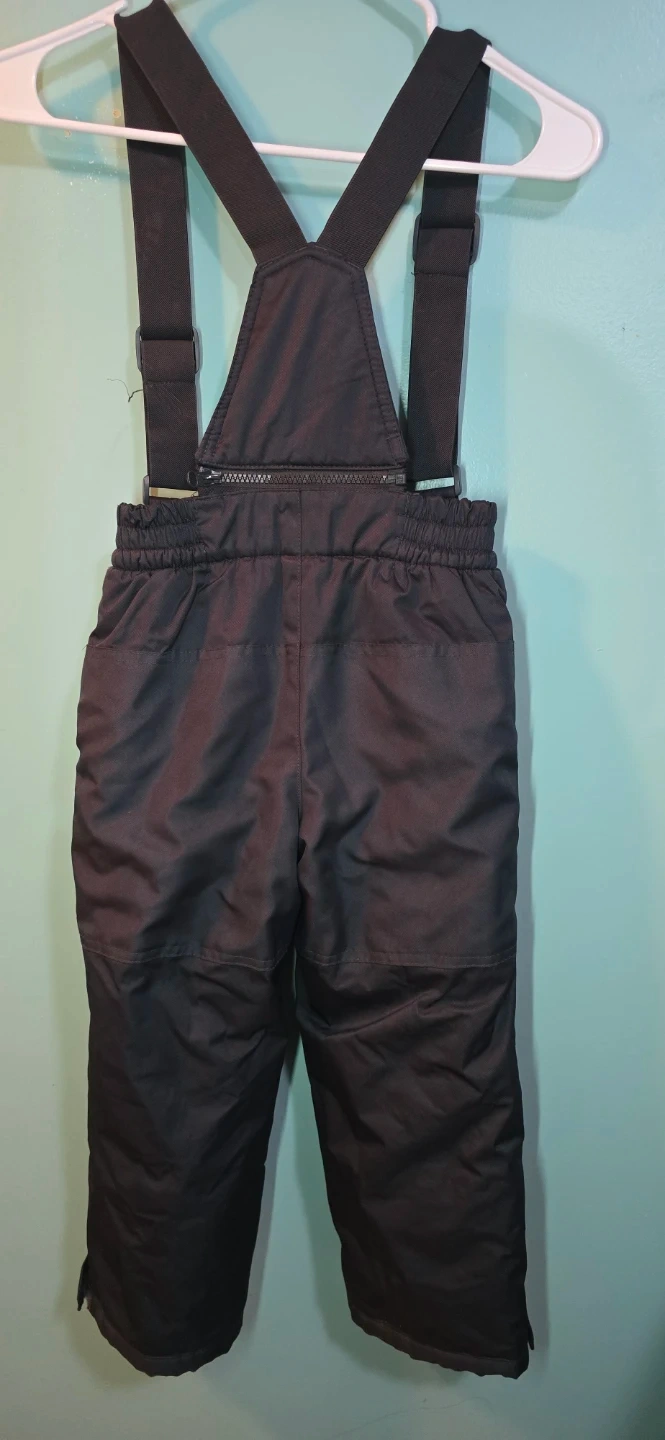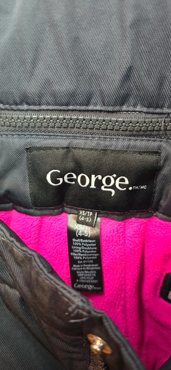 George black snow bibs with adjustable suspenders and a zippered front. Size XS/TP, fitting 4-5 years old. Made with 100% polyester shell and lining. Great for keeping kids warm and dry during winter activities!