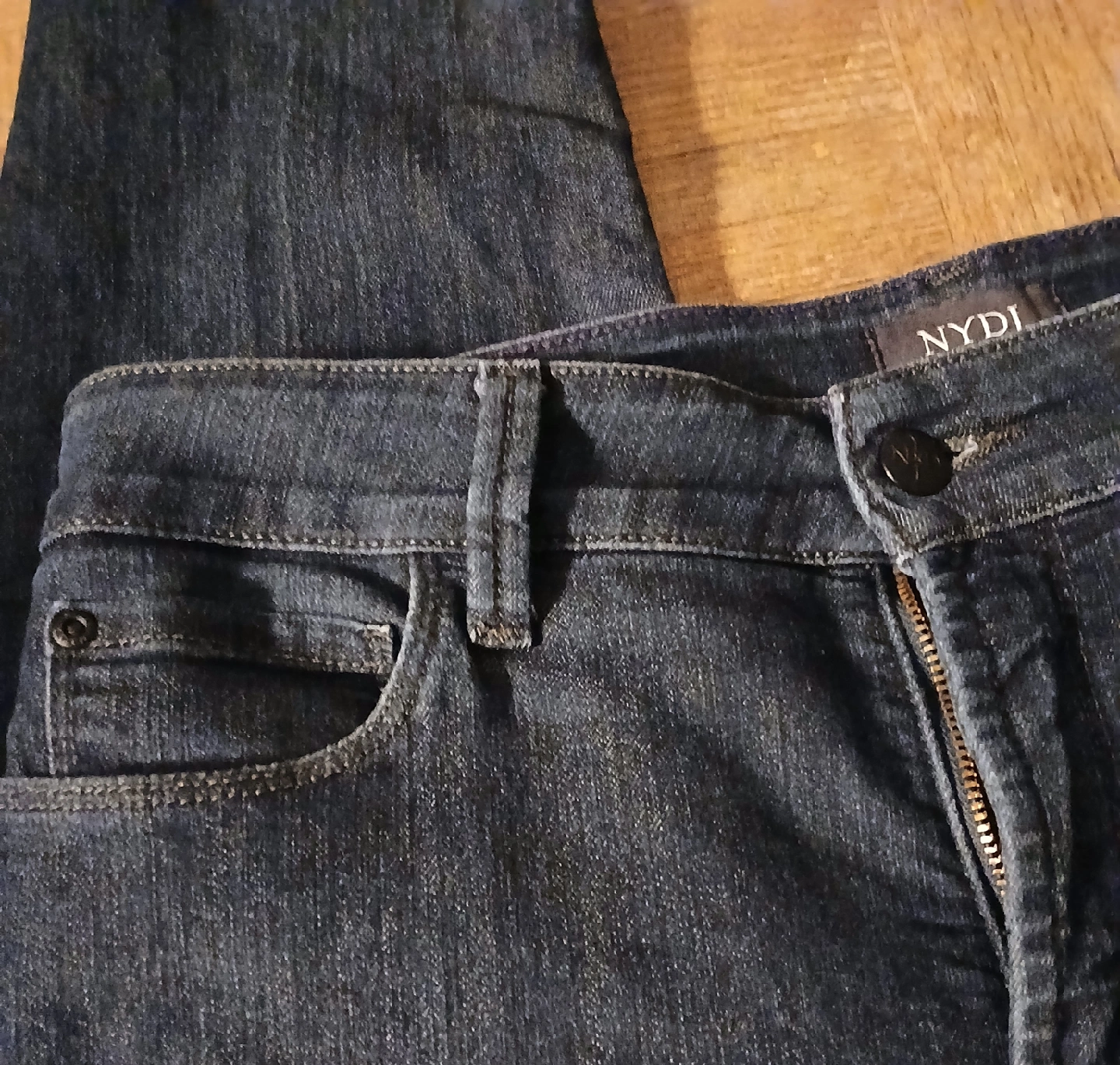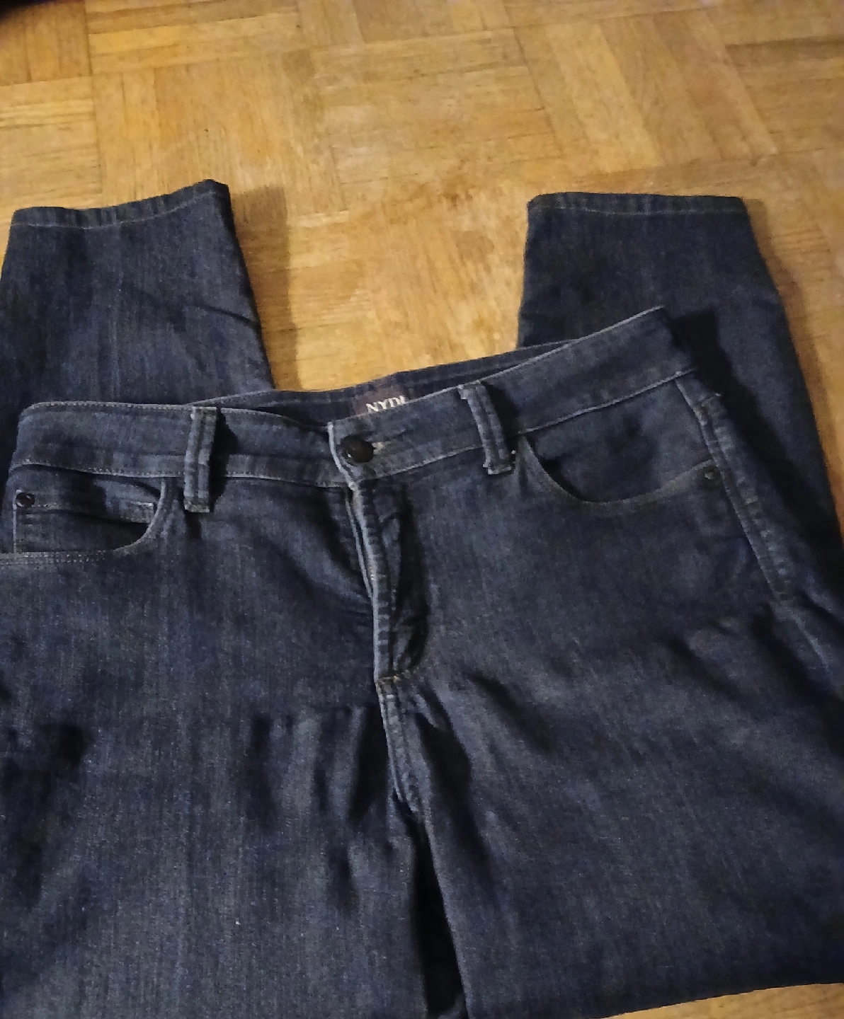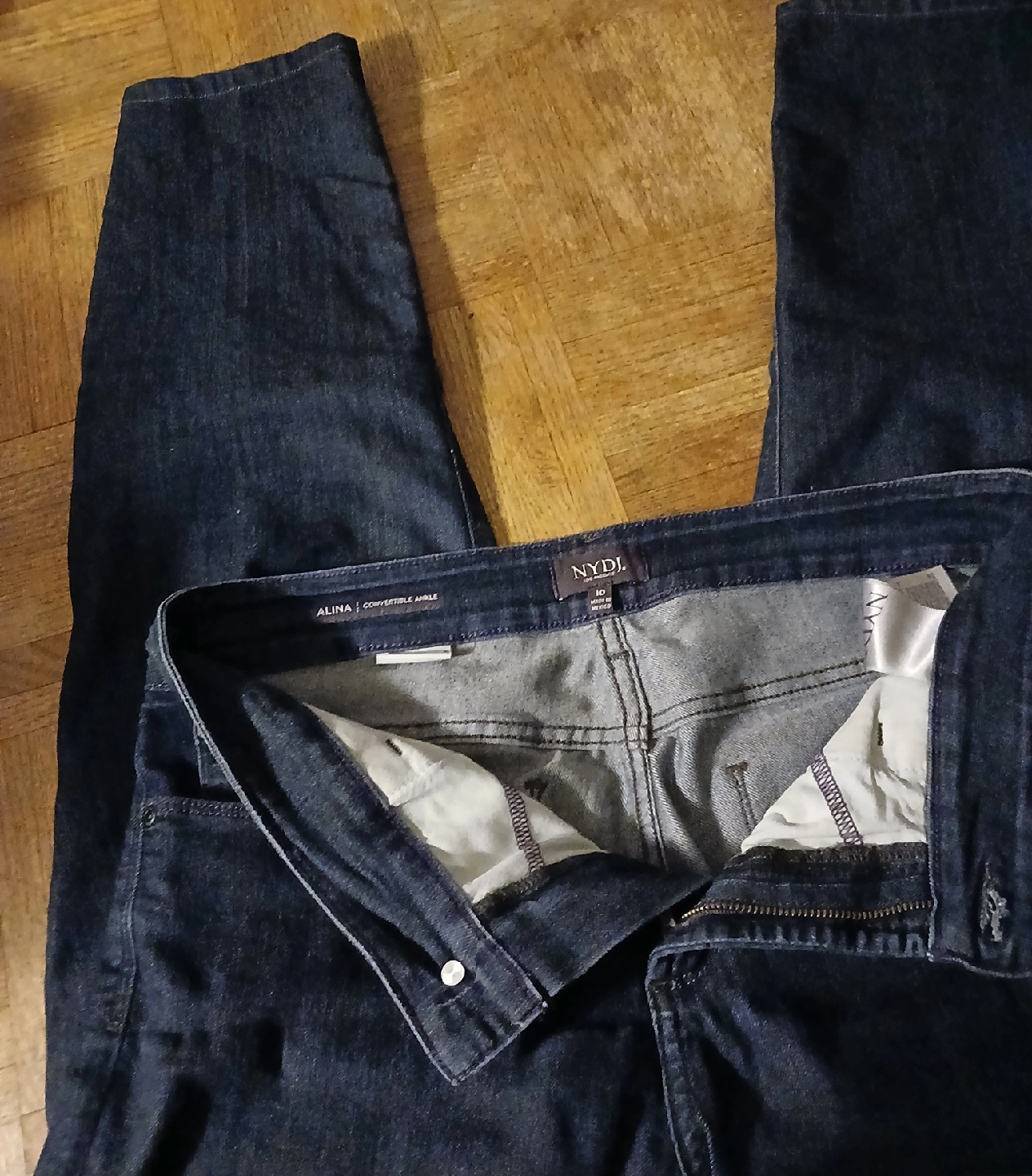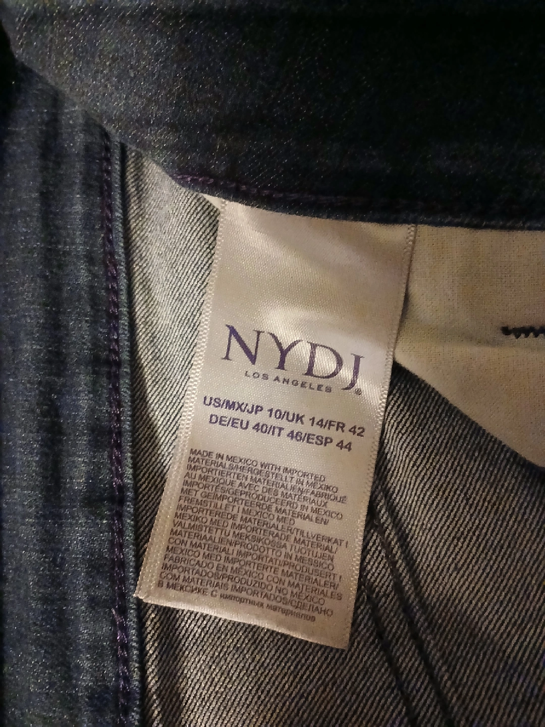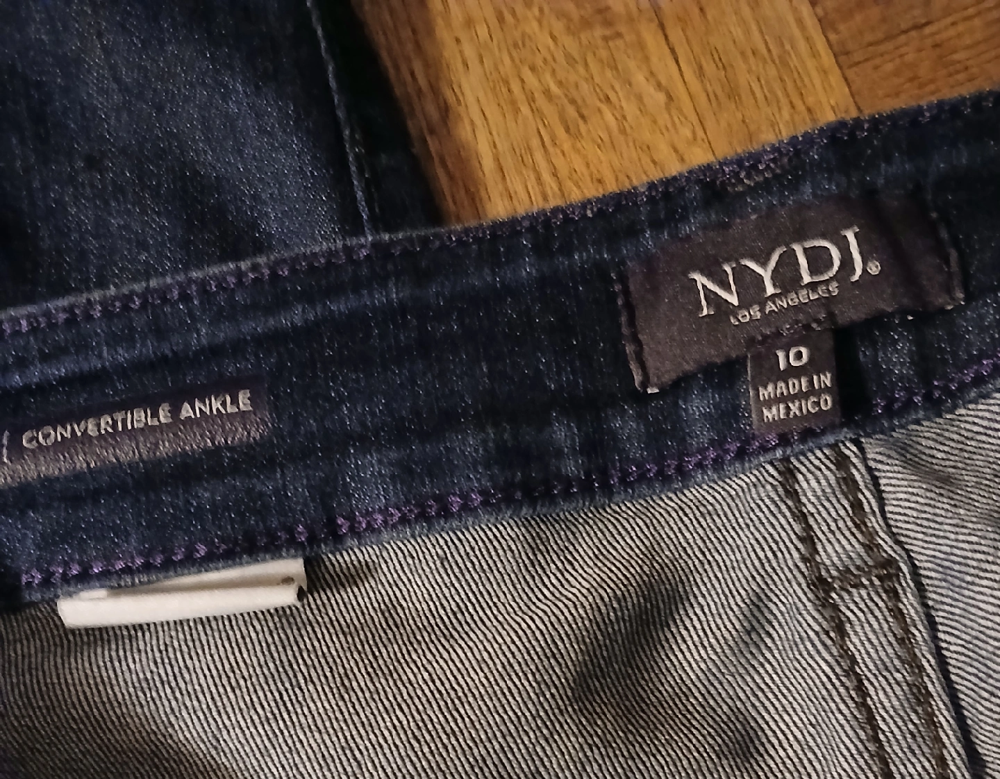 NYDJ Alina Convertible Ankle Jeans in size 10. These jeans are a dark wash denim and in excellent condition The tag indicates they are made in Mexico with imported materials.