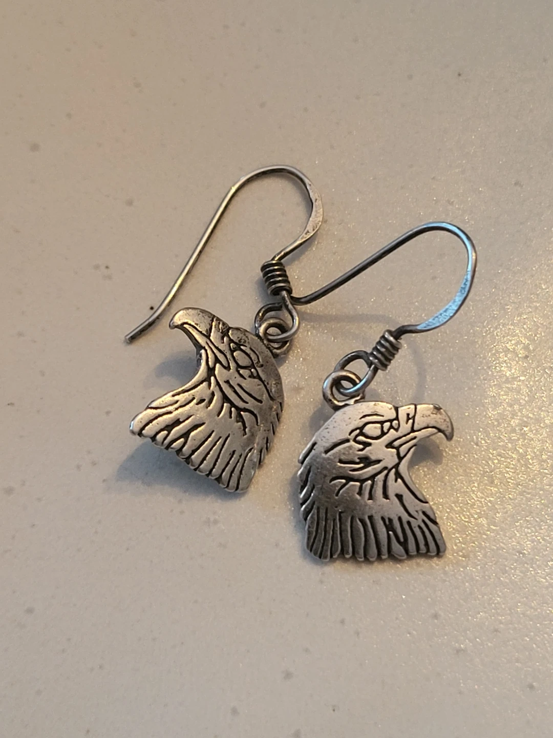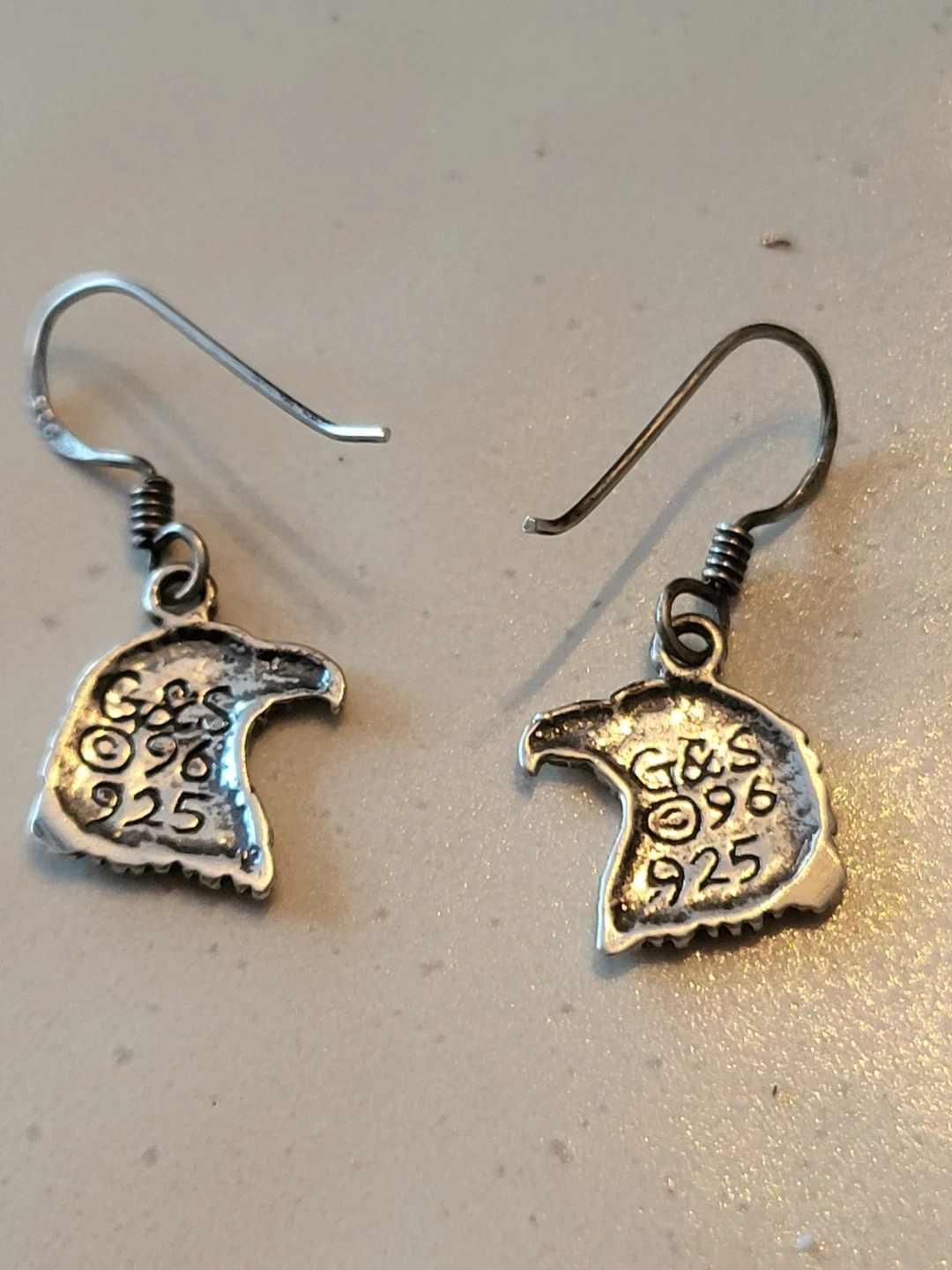 These are a pair of sterling silver earrings with an eagle head design. They are stamped with 'G&S 96 925'. These earrings would make a nice gift for an animal lover!