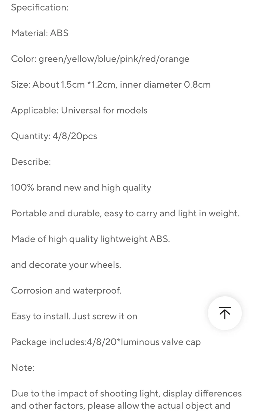 I have a set of 20 brand new, high quality luminous valve caps for car tires! They're made of lightweight ABS material, making them portable and durable. They're easy to install, just screw them on! The size is about 1.5cm * 1.2cm, with an inner diameter of 0.8cm