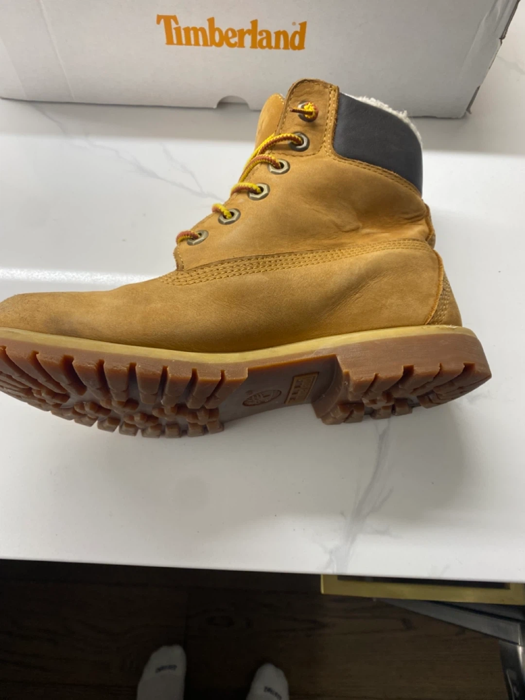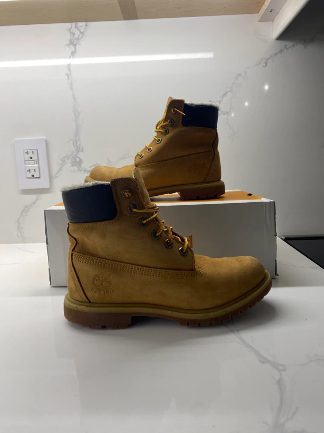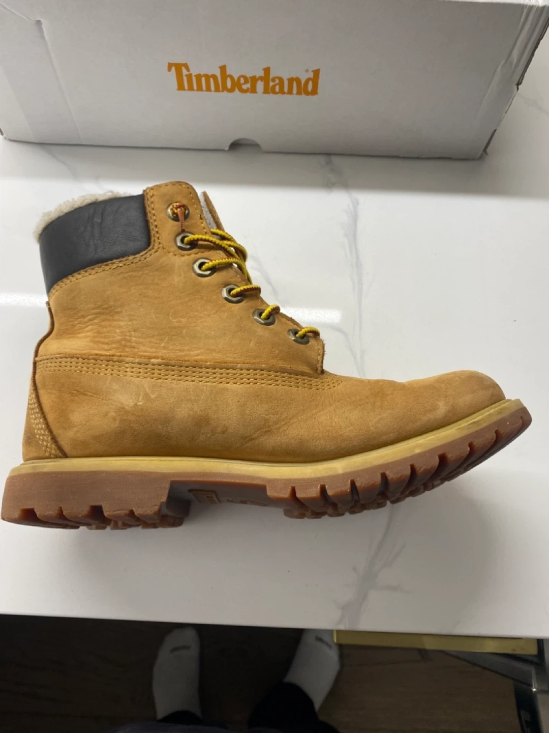 Selling a pair of Timberland boots in a size 6. They are in good condition and come with the original box. Perfect for the fall and winter weather!